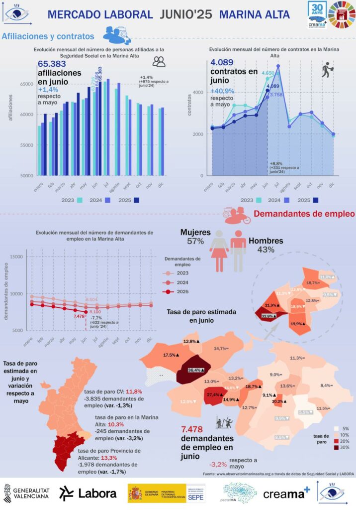 El mes de junio en la Marina Alta marcó un nuevo hito en términos de empleo con un total de 892 nuevas afiliaciones a la Seguridad Social, lo que sitúa el número de ocupados en 65.383 personas. Este aumento, impulsado por el inicio de la temporada turística, representa una mejora en comparación con el mismo mes del año pasado, aunque en términos interanuales, el crecimiento se ha moderado. El número total de afiliados ha aumentado en 875 personas respecto a junio de 2024, lo que supone un incremento del 1,36%. Sin embargo, esta cifra es inferior a los aumentos extraordinarios registrados en los últimos años post-COVID.