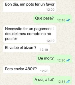 Los casos siguen un patrón similar: la víctima recibe un mensaje de alguien que parece ser un familiar o amigo cercano, que incluso escribe en valenciano con errores gramaticales típicos para sonar más real. Esta persona pide dinero con urgencia, alegando estar en una situación comprometida. El dinero se solicita mediante transferencia bancaria o Bizum, acompañado de una cuenta para efectuar el pago.