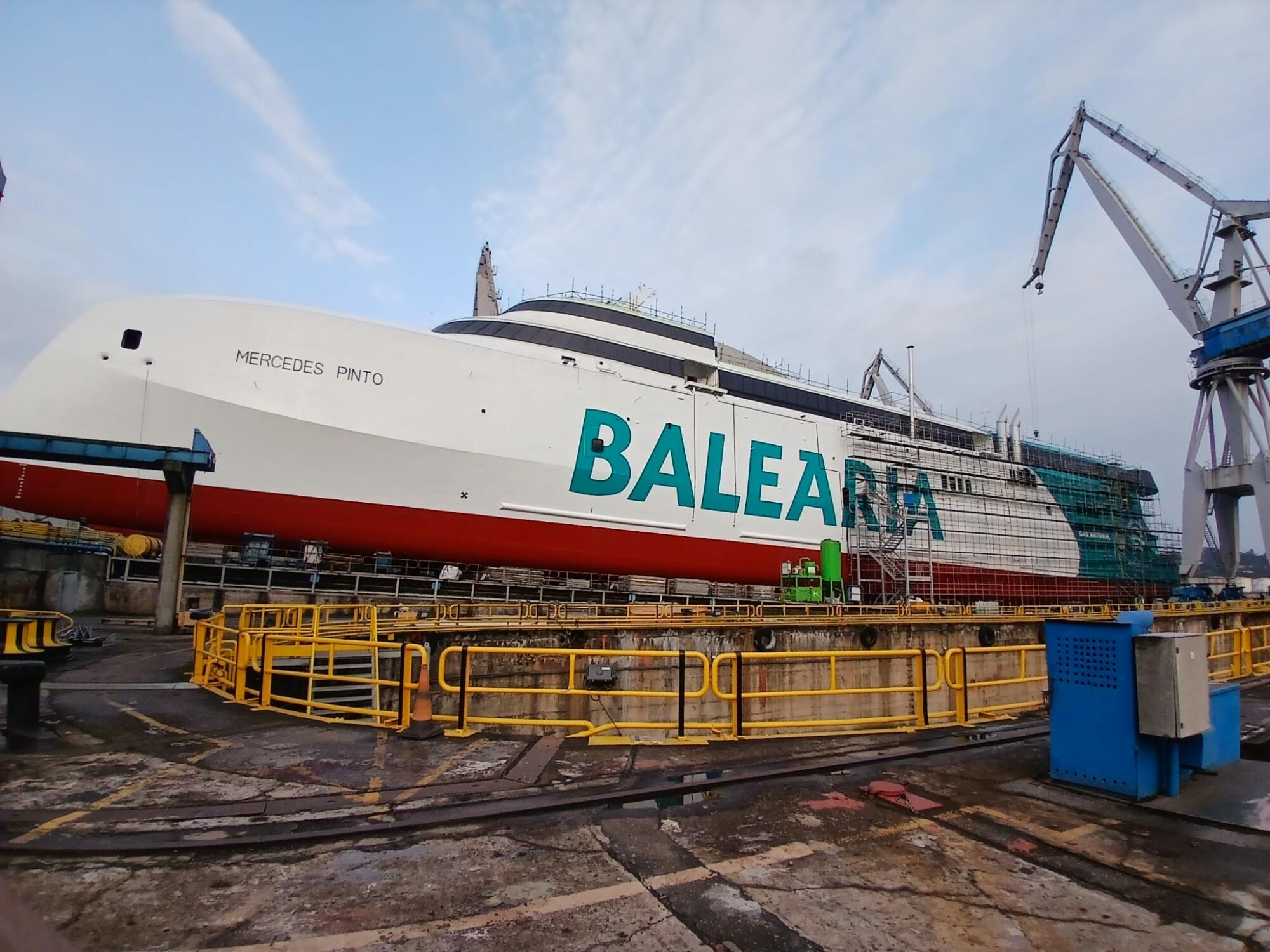 Baleària avanza con paso firme en la construcción del Mercedes Pinto, su tercer fast ferry propulsado por gas natural, cuya botadura está programada para el próximo 19 de septiembre en los Astilleros Armón de Gijón. Actualmente, el proyecto se encuentra en una etapa muy avanzada: el casco ya está completamente ensamblado y se están instalando los tanques de GNL, los motores principales y auxiliares, así como el sistema de propulsión, el cableado eléctrico y las tuberías.