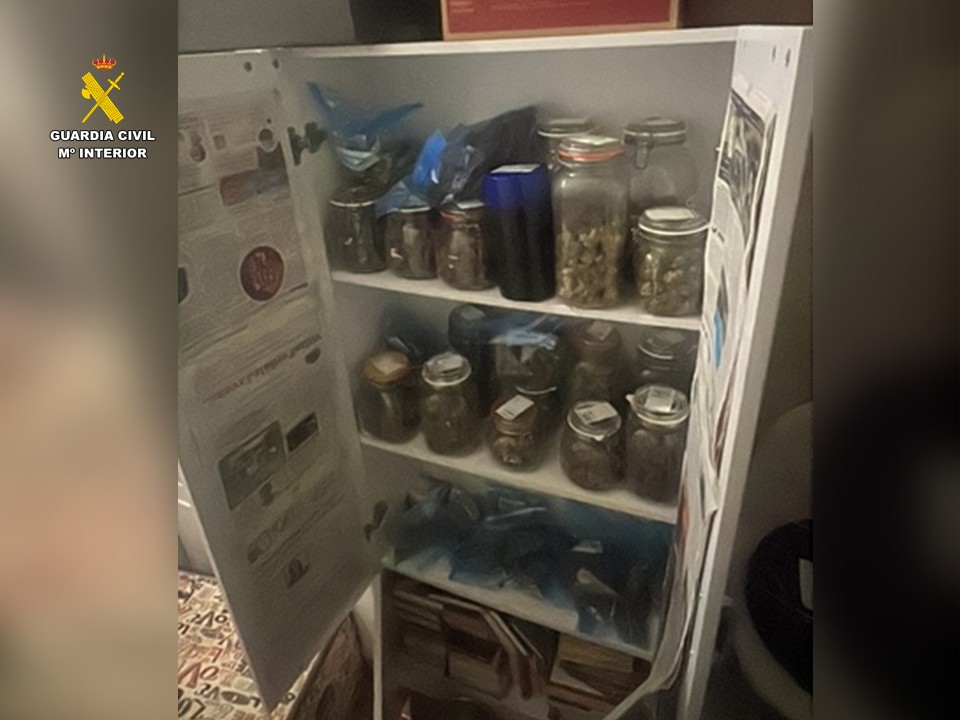 En la planta inferior de la vivienda, los agentes encontraron un armario cerrado en el que se almacenaban 28 tarros herméticos con cogollos secos de marihuana, junto con 30 bolsas de plástico con cogollos listos para su distribución. También se hallaron varias bolsas etiquetadas con distintas variedades de cannabis, así como una vinoteca destinada a la conservación de semillas y útiles para el pesaje y manipulación de la droga.
