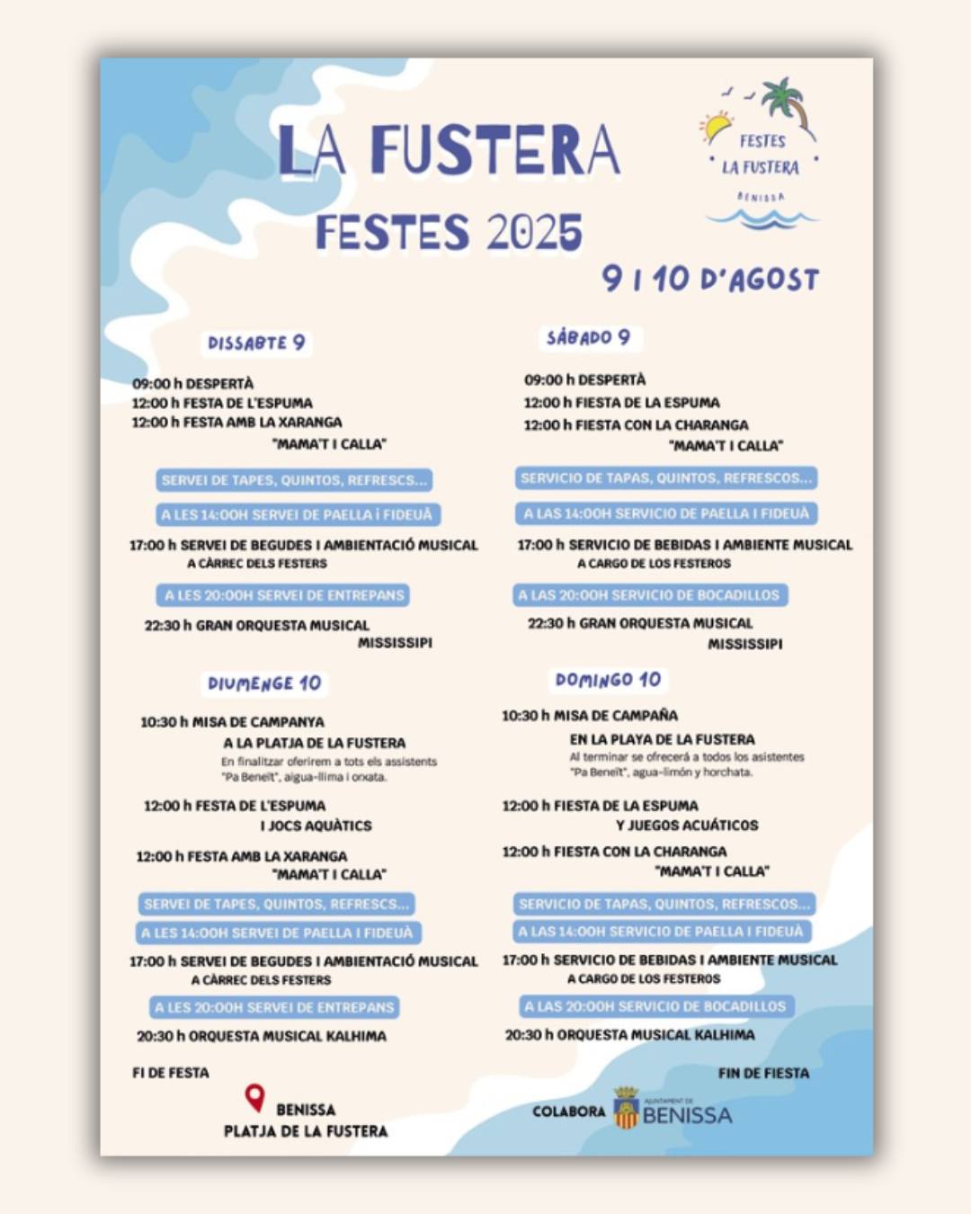 El domingo comenzará con una misa de campaña a las 10:30 h en la playa de La Fustera. Al finalizar, se ofrecerá a los asistentes «pa beneït», agua-limón y horchata. A las 12:00 h se repetirá la Fiesta de la Espuma, esta vez con juegos acuáticos, seguida de una nueva actuación de la xaranga «Mamat i Calla». Como el día anterior, se ofrecerán tapas, quintos y refrescos, y se servirá paella y fideuà a las 14:00 h. A las 17:00 h, el ambiente festivo continuará con música y bebidas, y a las 20:00 h se ofrecerá de nuevo cena de bocadillos. El broche final lo pondrá la orquesta musical Kalhima, que actuará a las 20:30 h y marcará el cierre de las fiestas.