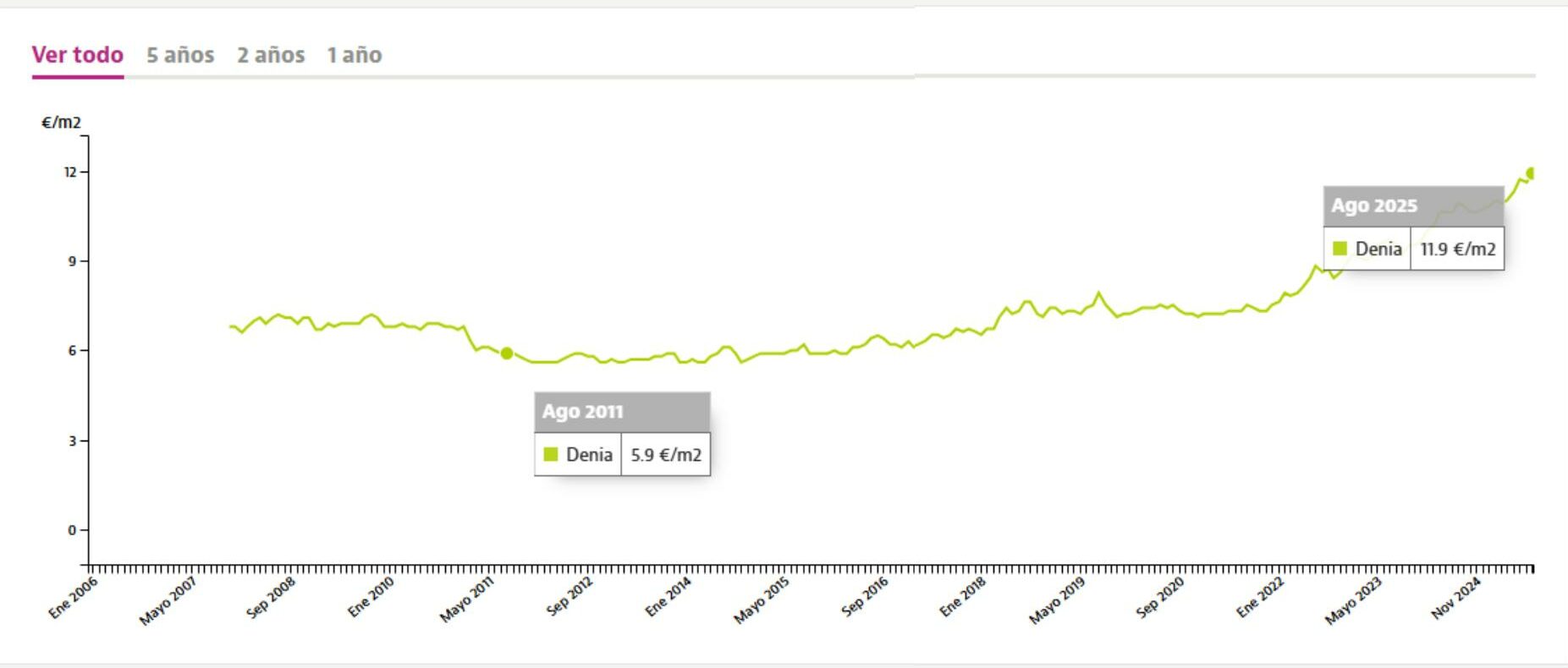 El precio del alquiler en Dénia se ha disparado en los últimos años; si comparamos los datos de agosto del 2011 (5.9/m2) con los datos de agosto de este 2025 (11.9/m2), encontramos una diferencia de 6 euros/m2. Una subida generalizada que no solo se ciñe a la capital comarcal, sino a toda la Marina Alta.