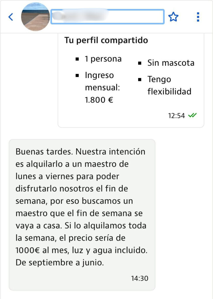 Al contactar con los propietarios de una oferta, la respuesta que recibieron fue abrumadora. «Nuestra intención es alquilarlo a un maestro de lunes a viernes, para poder disfrutarlo durante el fin de semana nosotros y que se vuelva a su casa», escribía el arrendatario en la conversación.