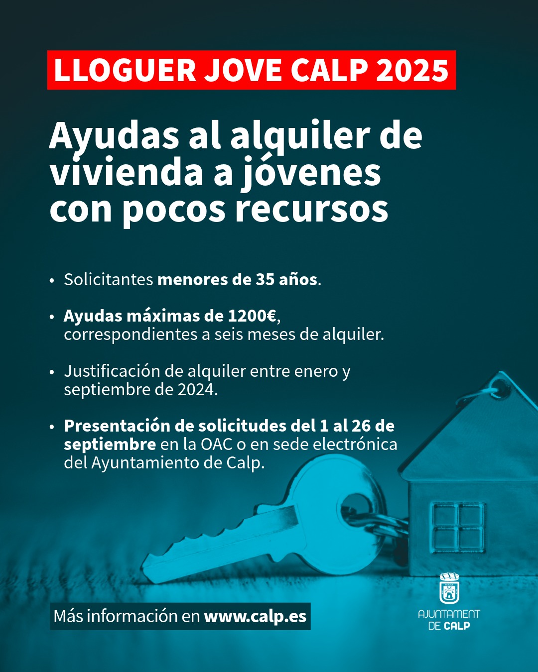 El Ayuntamiento de Calp ha convocado una nueva edición de las ayudas municipales al alquiler joven (Lloguer Jove) 2025, dirigidas a personas jóvenes con escasos recursos económicos.