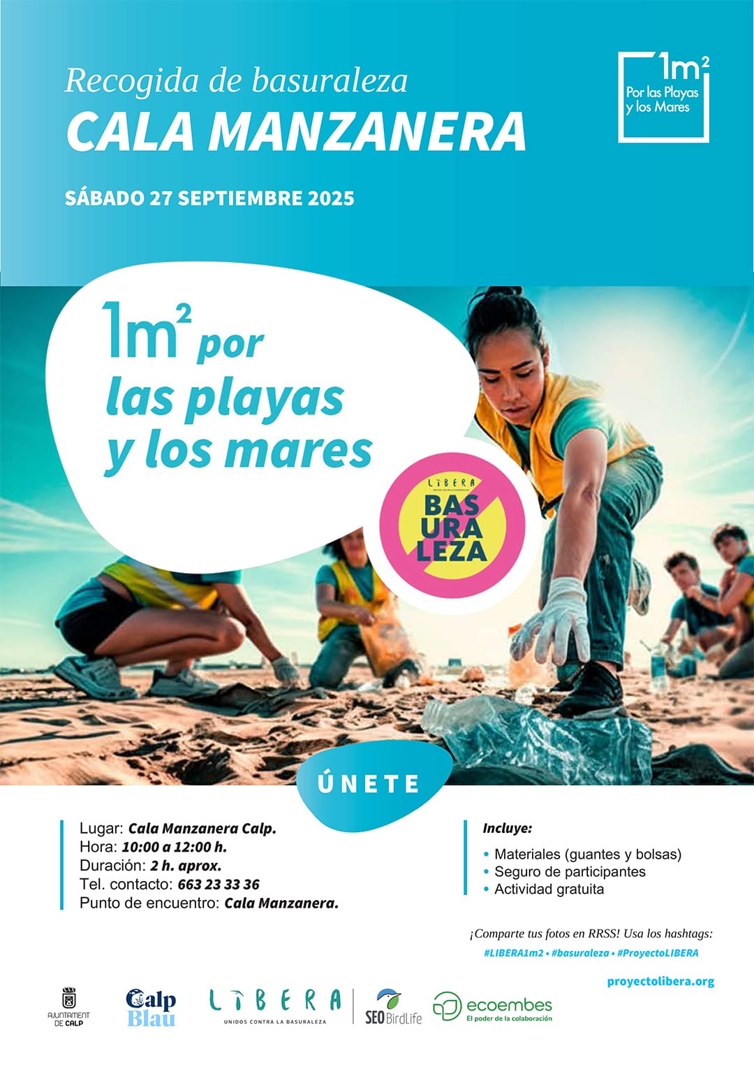 El punto de encuentro será la misma Cala Manzanera, y se invita a todos los interesados a sumarse a esta causa que cuenta con la colaboración del Ayuntamiento de Calp, Calp Blau, Libera ‘Unidos contra la basuraleza’, SEO BirdLife y Ecoembes.
