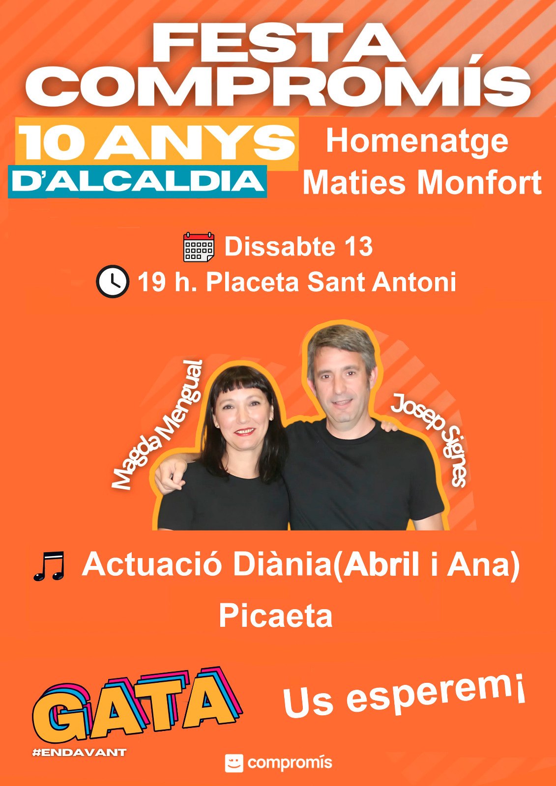 Compromís per Gata de Gorgos ha invitado a toda la ciudadanía a celebrar una fiesta muy especial, el sábado 13 de septiembre, para conmemorar los 10 años de su gestión en la alcaldía del municipio. Primero con Magda Mengual como alcaldesa y después con Josep Signes.