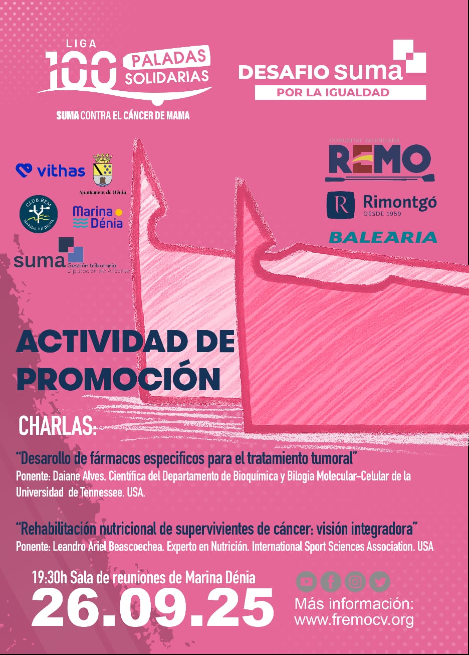 Además, el viernes 26 de septiembre, a las 19:00 horas, en la sala de conferencias de Marina Dénia, se celebrarán dos importantes charlas relacionadas con el cáncer de mama. La primera, titulada «Desarrollo de fármacos específicos para el tratamiento tumoral», será impartida por Daiane Alves, científica del departamento de Bioquímica y Biología Molecular-Celular de la Universidad de Tennessee. La segunda charla, titulada «Rehabilitación nutricional de supervivientes de cáncer: visión integradora», será ofrecida por Leandro Ariel Beascoechea, experto en nutrición del International Sport Sciences Association.