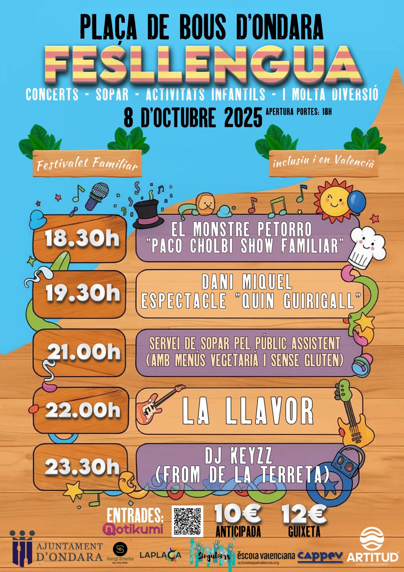 El 8 de octubre, la plaza de Toros de Ondara se convertirá en el epicentro de la música, la cultura y la lengua con el Fesllengua 2025, un evento festivo y reivindicativo. A partir de las 18:00 horas, se ofrecerán actividades para todos los públicos, incluyendo el espectáculo infantil ‘El Monstre Petorro’, el concierto de Dani Miquel y la actuación del grupo La Llavor. También habrá una sesión de música con DJ Keyzz. Las entradas cuestan 10 € anticipadas y 12 € en taquilla.