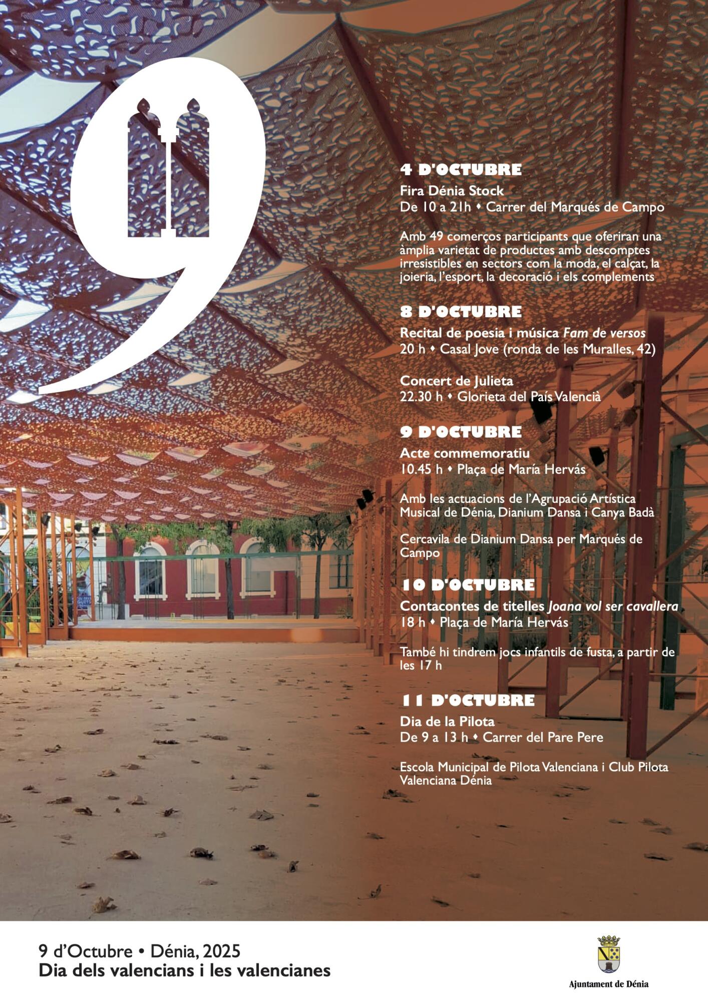 El acto conmemorativo se celebrará el 9 d’Octubre, a las 10:45 horas, en la plaza de María Hervás. Junto a los parlamentos de las autoridades, actuarán la Agrupación Artística Musical de Dénia, Dianium Dansa y Canya Badà. Al finalizar, Dianium Dansa realizará un pasacalle por la calle Marqués de Campo.