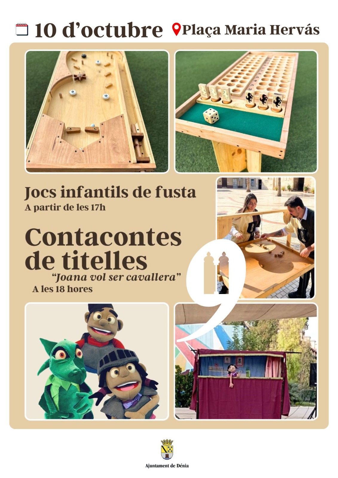 El viernes 10 de octubre, a partir de las 17 horas, se realizarán juegos infantiles de madera para los más pequeños en la plaza de María Hervás y, a continuación, a las 18 horas, el cuentacuentos de títeres “Joana vol ser cavallera”.
