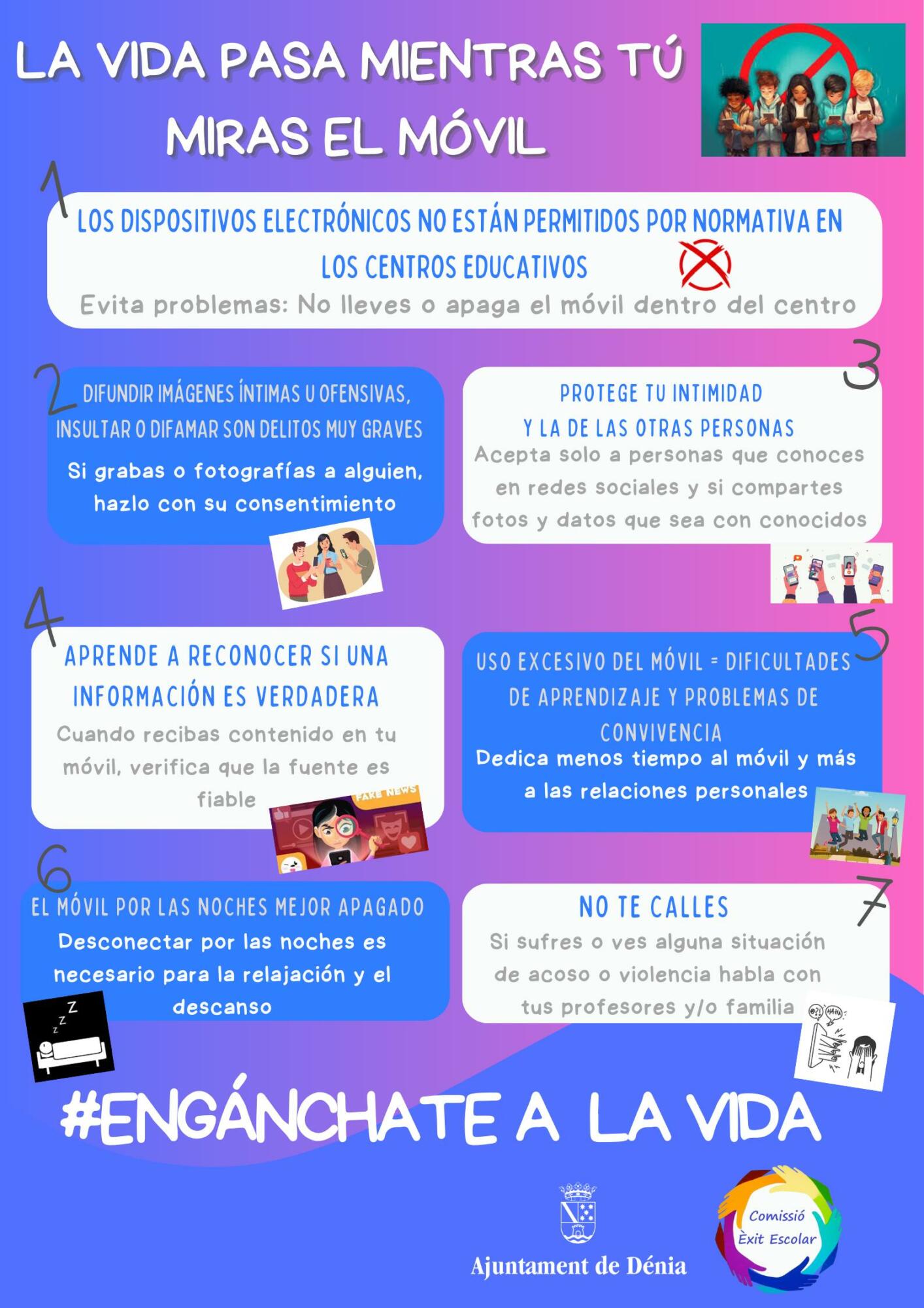Así, la publicación recuerda que los móviles no están permitidos por normativa en los centros educativos (Resolución de la Conselleria de Educación del 17 de abril de 2024); que difundir imágenes íntimas u ofensivas, insultar o difamar son delitos muy graves; anima a las personas usuarias a verificar las informaciones que les llegan y advierte que un uso excesivo del móvil dificulta el aprendizaje y origina problemas de convivencia; además de recomendar que, por la noche, mejor apagarlos.