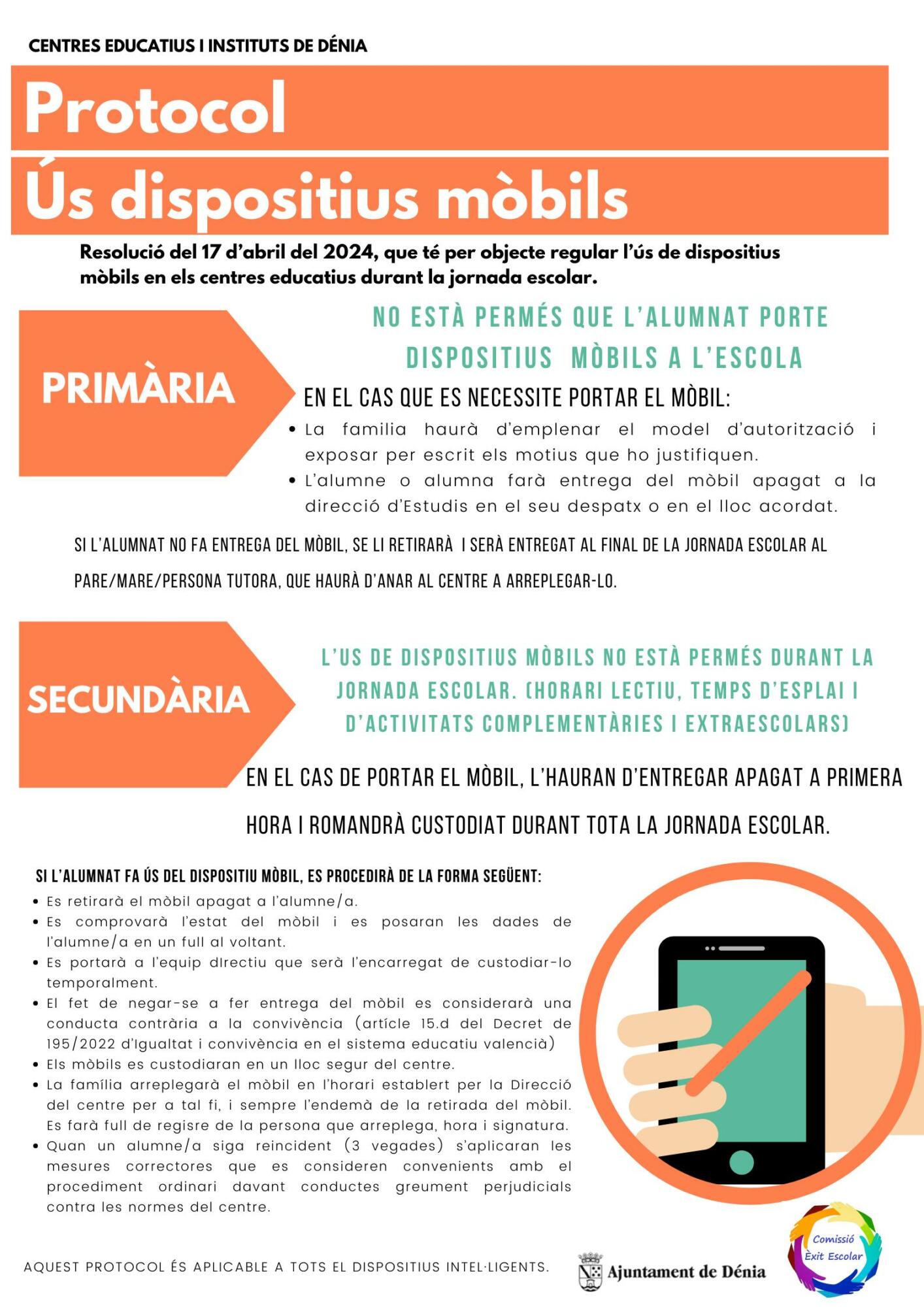 Ante la necesidad de abordar el impacto que están teniendo los dispositivos móviles en los centros educativos y dentro del trabajo de prevención que realiza, la Comisión de Éxito Escolar ha creado un protocolo unificado para todos los centros escolares de Dénia, La Xara y Jesús Pobre sobre el uso del móvil.