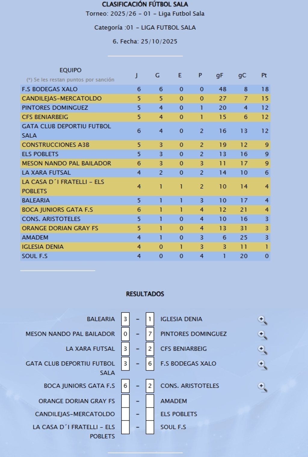 En cuanto a los partidos aplazados, se encuentran el Orange Dorian Gray-Amadem, Candilejas-Els Poblets y La Casa d’I Fratelli-Soul FS, que deberán jugarse en otra fecha pendiente.