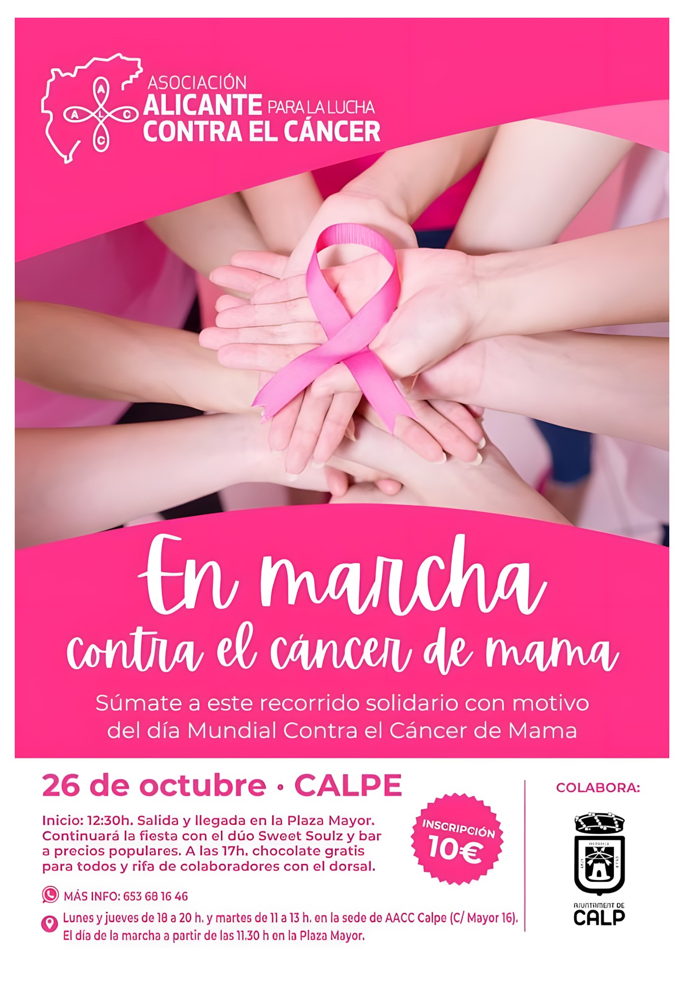 El próximo domingo 26 de octubre, Calp acogerá la tradicional Marcha Rosa en apoyo a la lucha contra el cáncer de mama. La cita será a las 12:30 horas en la Plaza Mayor, donde dará inicio esta caminata solidaria organizada por la Asociación Alicante para la Lucha Contra el Cáncer.