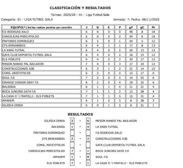 La séptima jornada de la Liga Comarcal de Fútbol Sala de Acydma estuvo marcada por varias victorias contundentes y un aplaudido empate. La jornada arrancó con un aplazamiento entre Bodegas Xaló y Pinturas Dominguez, lo que permitió a Candilejas Mercatoldo aprovechar la oportunidad y sumar tres puntos con una clara victoria por 7-1 sobre Boca Juniors Gata, lo que les permitió compartir el liderato con el equipo de Xaló.