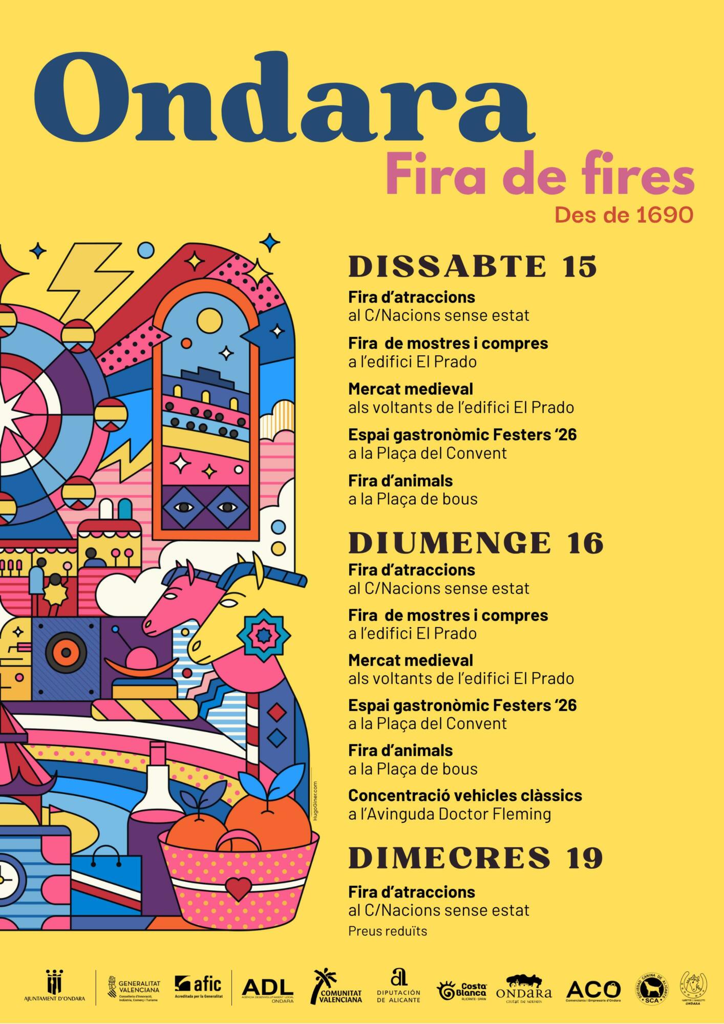 Además, la Feria de Atracciones permanecerá instalada en la calle Nacions Sense Estat, y los Espacios Gastronómicos de los Festeros de la Soledad y Cristo 2026 estarán ubicados esta semana en la Plaza del Convento. Los miércoles 12 y 19 de noviembre serán los días de los Niños y Niñas en la Feria de Ondara 2025, con precios reducidos en las atracciones. La Feria de Ondara está organizada por la concejalía de Turismo y Promoción Económica del Ayuntamiento de Ondara.