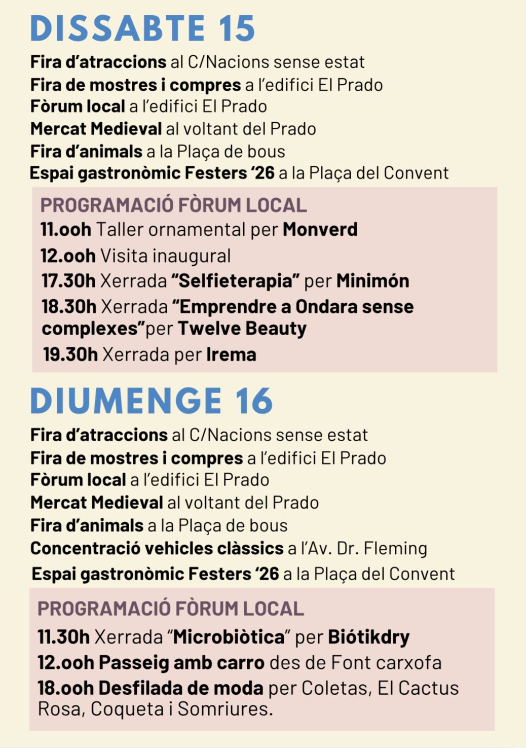 Por otro lado, este segundo fin de semana de feria se montará el Mercado Medieval, alrededor del Prado y la Plaza de Toros (en la Av. General Bosch y Vicent A. Estellés), y la tradicional Feria de Animales en la plaza de Toros (organizada con la colaboración de la Asociación de Carreters y Cavallistes de Ondara). Desde la Asociación de Carreters y Cavallistes se dispondrán de carros al mediodía el domingo 16, para llevar a pasear a los niños y niñas que lo deseen (desde la Font de la Carxofa).