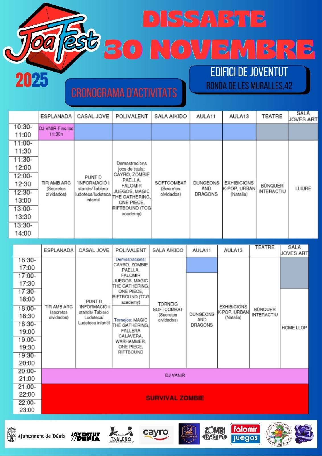 La Concejalía de Juventud de Dénia ha anunciado la celebración de la nueva edición del JoaFest, un festival de ocio alternativo que ha ganado popularidad en sus ediciones anteriores y que, en 2025, se llevará a cabo el sábado 30 de noviembre, desde las 11:00 h hasta las 23:00 h, en el edificio de Juventud.