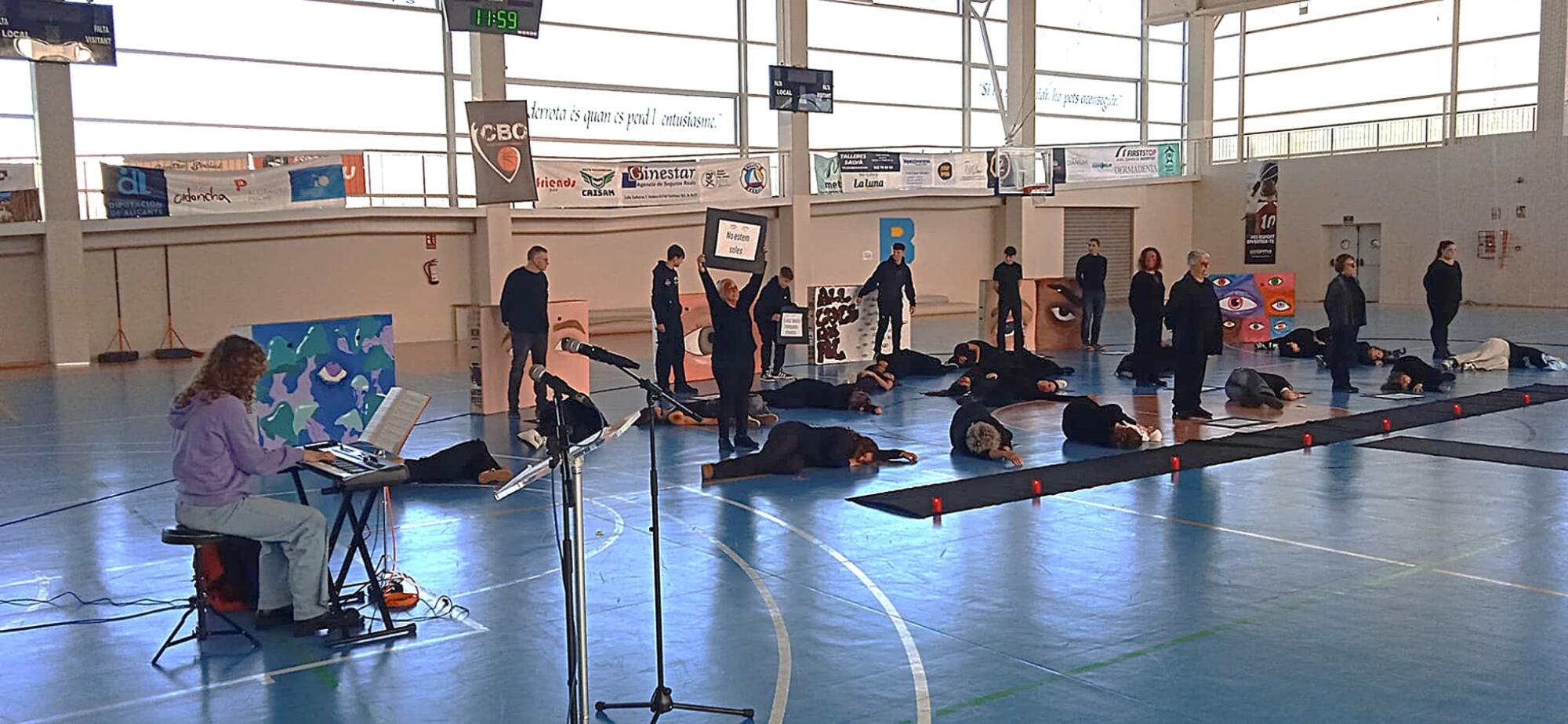 El acto comenzó con la bienvenida de la Comisión de Igualdad del IES, seguida por la lectura del manifiesto a cargo de dos alumnos. Después, la performance: mujeres maquilladas con marcas de violencia (gracias al magnífico trabajo del alumnado del CFGM Estética y Belleza del IES Xebic), acompañadas por hombres con el rostro cubierto, avanzaban en silencio hasta que, finalmente, con el toque de una campana, caía cada cuerpo al suelo. A su lado, carteles con mensajes que resonaron como un clamor: “Los chicos somos parte de la solución”, “No estamos solas”. Un gesto simbólico que convirtió el dolor en fuerza y la memoria en denuncia.