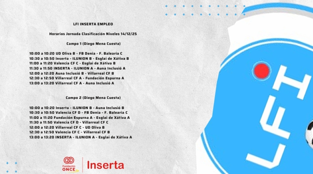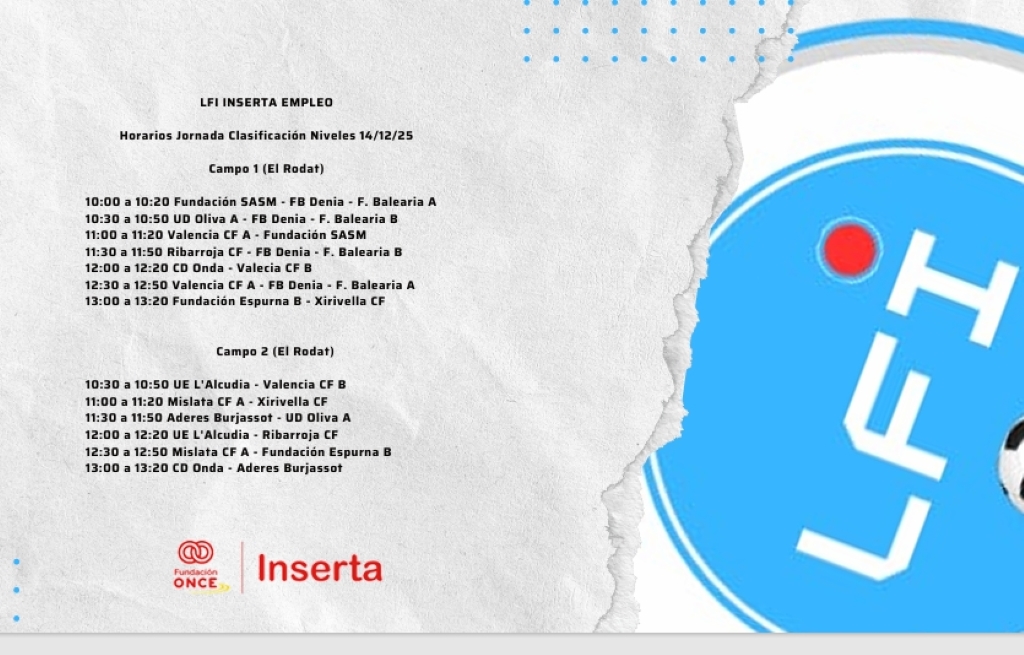 Dénia se convertirá en el epicentro del fútbol inclusivo de la Comunidad Valenciana al acoger, por primera vez, la jornada de clasificación de niveles de la Liga de Fútbol Inclusivo (LFI) Inserta Empleo. Los campos municipales Diego Mena Cuesta y El Rodat serán el escenario de una intensa mañana deportiva, de 10 a 14 horas, en la que participarán clubes referentes en el ámbito de la inclusión.