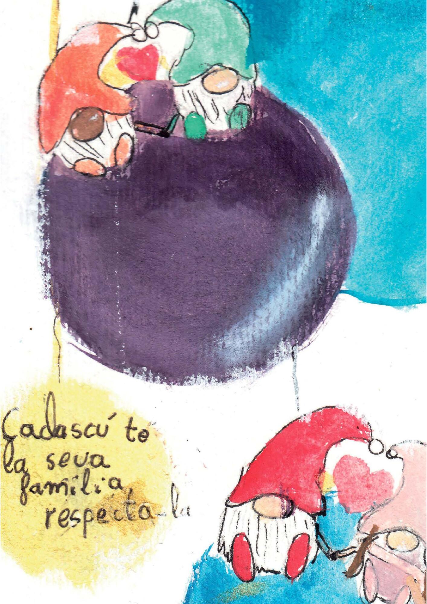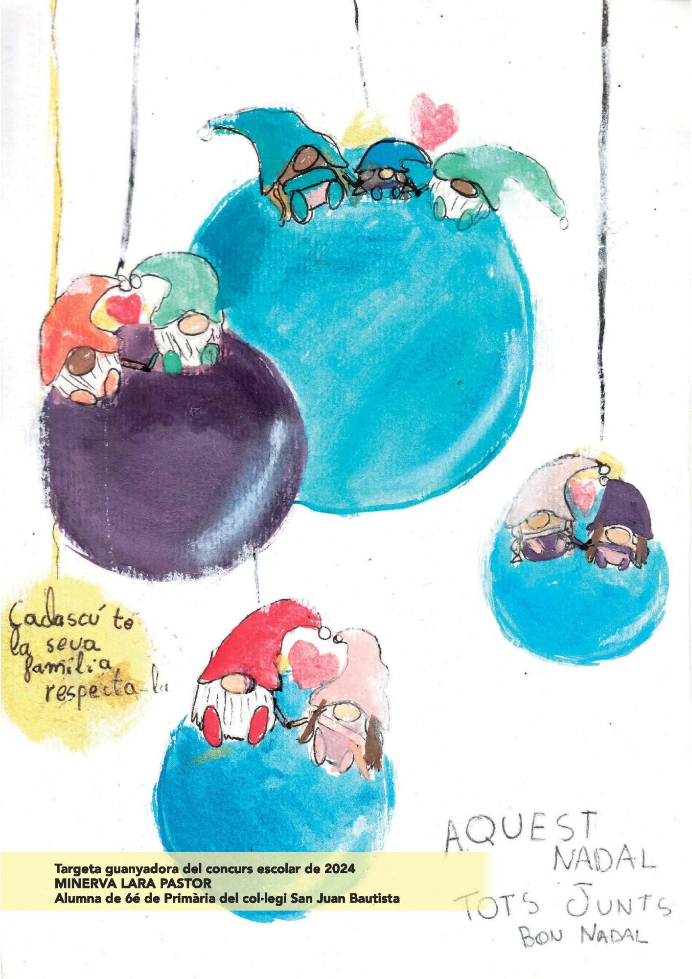 Este 2025 ilustra la felicitación y la programación municipal de Navidad el dibujo de Minerva Lara Pastor, alumna del colegio San Juan Bautista. Su trabajo presenta motivos muy navideños –coloridas bolas del árbol y pequeños duendes- con un mensaje muy potente que muestra familias diversas y hace un llamamiento al respecto y la tolerancia.