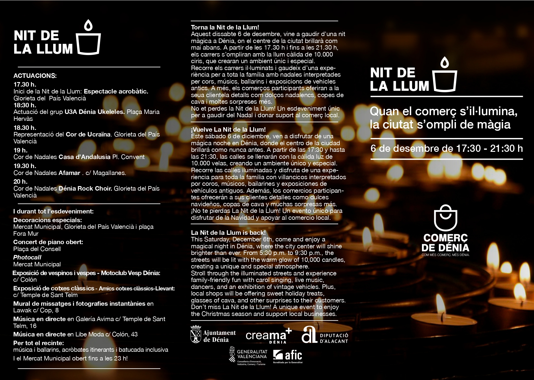 El evento dará comienzo a las 17:30 h con un espectáculo acrobático en la Glorieta del País Valencià, seguido por actuaciones en diferentes puntos del centro. A las 18:30 horas, se podrá disfrutar de la actuación del grupo U3A Dénia Ukeleles en la Plaça Maria Hervàs y de la representación del Cor de Ucraïna en la Glorieta del País Valencià. A partir de las 19:00 h, otros coros como el de Casa Andalucía (Plaza del Convento), el de Afamar (Calle Magallanes) y el de Dénia Rock Choir (Glorieta del País Valencià) pondrán la banda sonora a esta noche navideña. Además, se celebrarán exposiciones, música en directo, un «piano abierto» y otras actividades para toda la familia, como un mercado de vehículos clásicos y una exposición de vespas en la calle Colón.