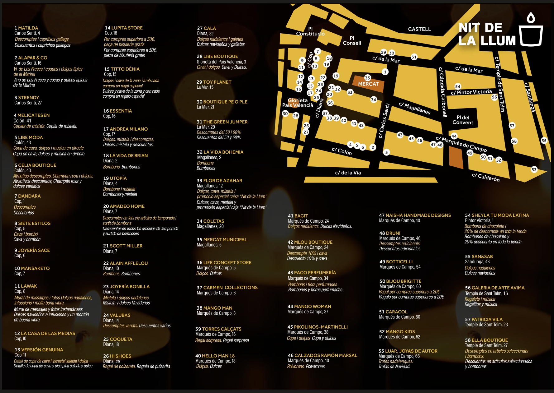 Más de 50 comercios en el centro de Dénia participan en esta edición de la Nit de la Llum, ofreciendo a sus clientes ofertas especiales, productos locales y sorpresas navideñas. Además, muchos de estos establecimientos ofrecen dulces navideños, cava de la zona y promociones en productos seleccionados.