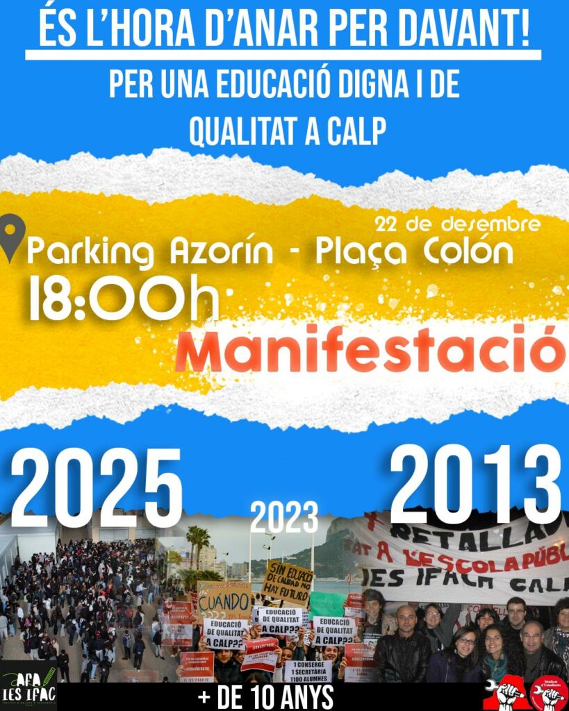 Con lemas como “Prou d’atacar l’educació calpina”, la protesta reclama que no se eliminen recursos mientras continúe la saturación, una planificación educativa realista y que las decisiones se adopten contando con la comunidad educativa. El objetivo, señalan, es defender una educación pública digna y con medios suficientes para todo el alumnado del municipio.