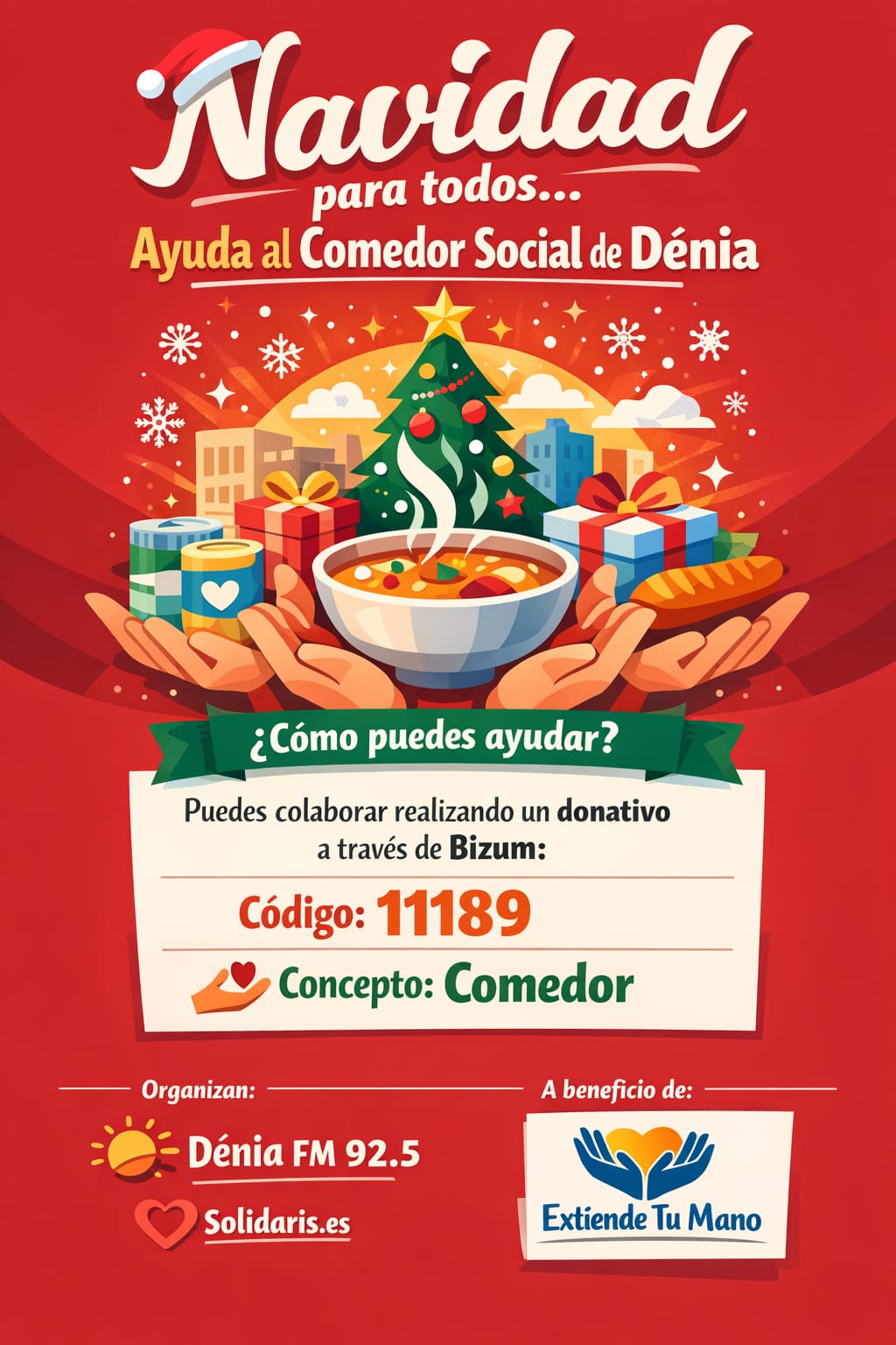 Lo que la asociación necesita para estas Navidades es poder ofrecer comida preparada para llevar el día 1 de enero (entregada el día 31 de diciembre). Por otro lado, para la comida del 25 de diciembre se busca algún postre especial. En esta campaña, también se busca proporcionar a las familias productos especiales para estas fiestas, como turrón, chocolate y otros postres navideños, para dignificar las celebraciones de los más necesitados, especialmente a los niños y mayores. Puedes entregar tus comidas en la sede de Extiende tu mano (C/ de Patricio Ferrándiz, 30 en Dénia).