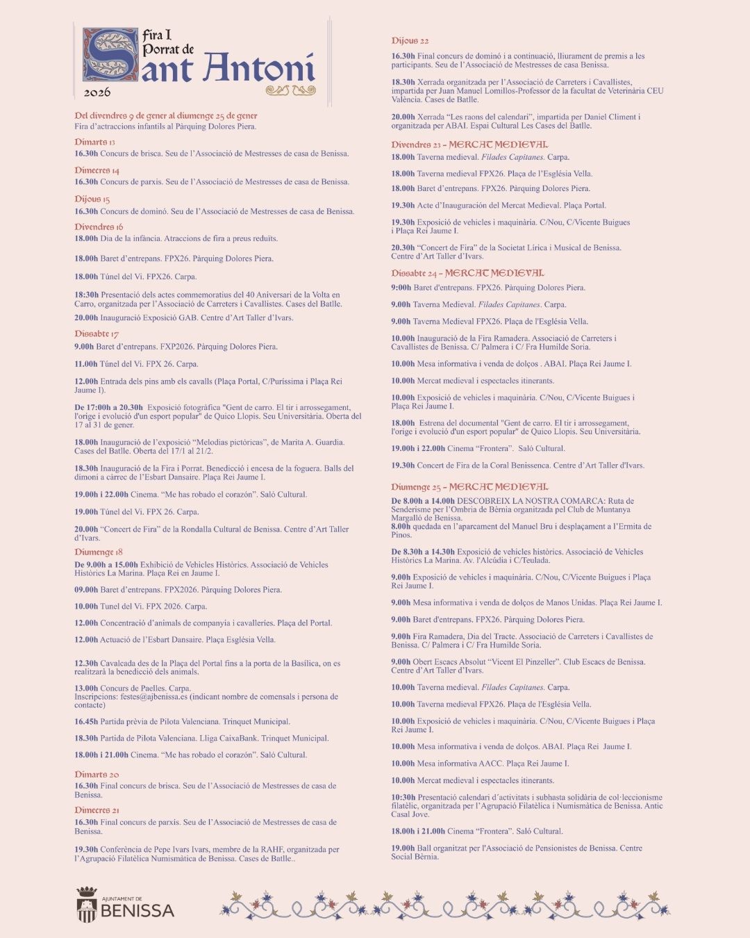 La Fira i Porrat de Sant Antoni de Benissa se celebrará durante dos intensos fines de semana, llenos de actividades culturales, festivas y sociales, que se desarrollarán del 16 al 25 de enero. La festividad arranca oficialmente este viernes 16 de enero, y promete ofrecer una experiencia inolvidable tanto para los habitantes de Benissa como para los visitantes de la comarca.