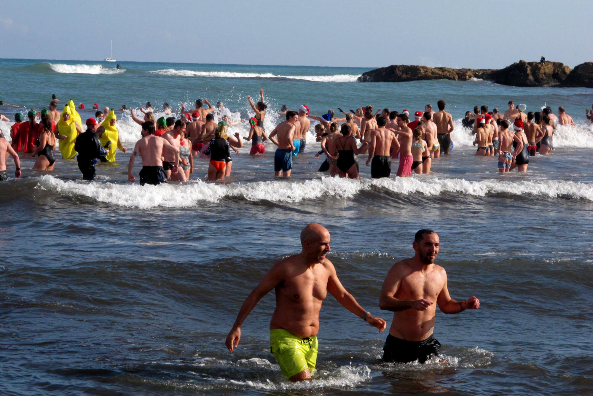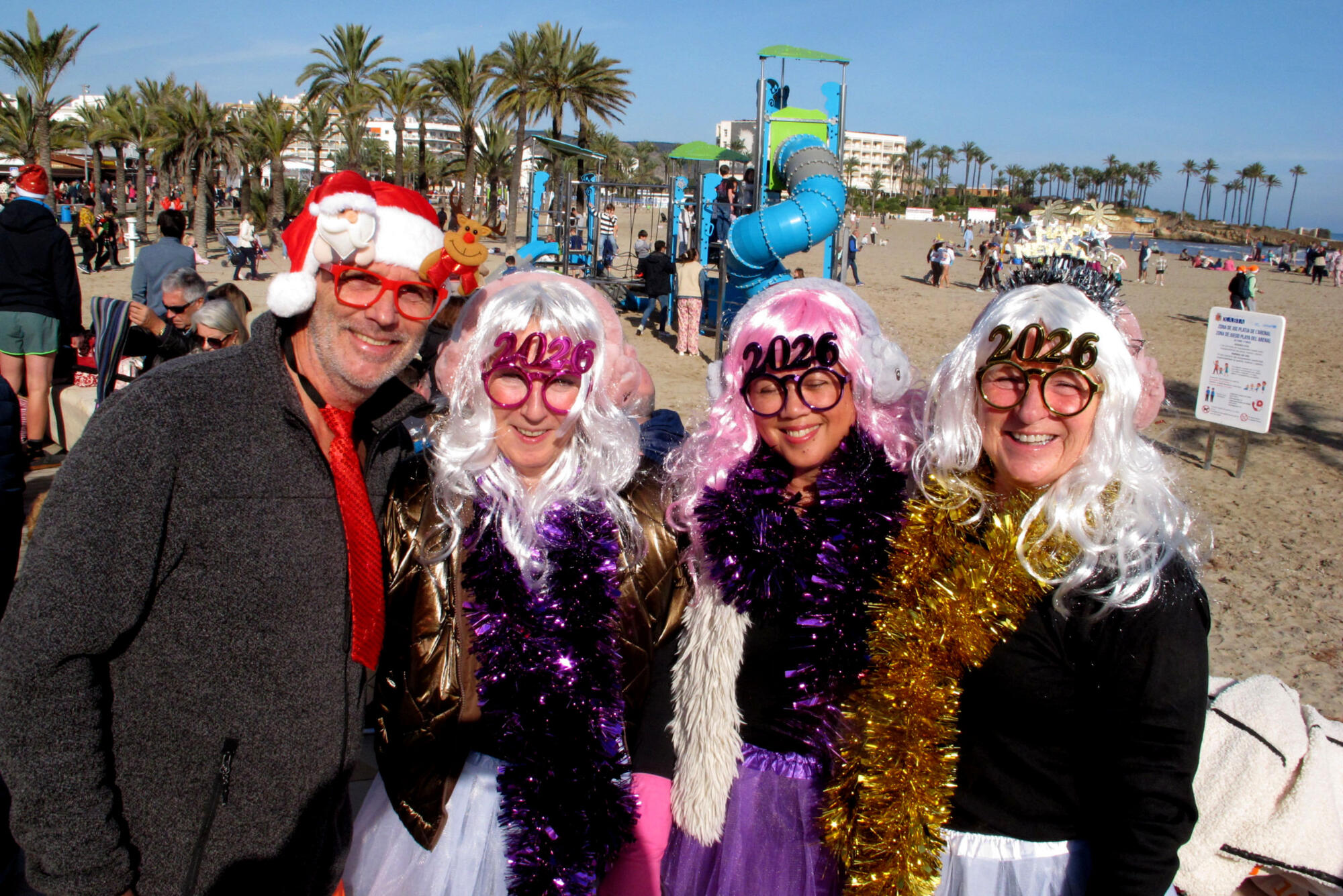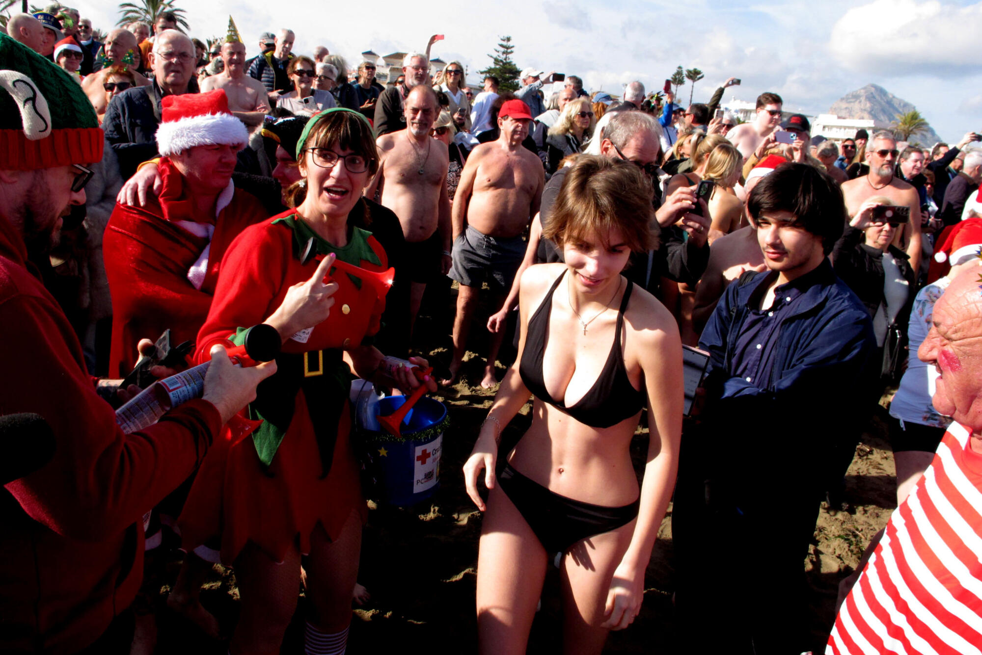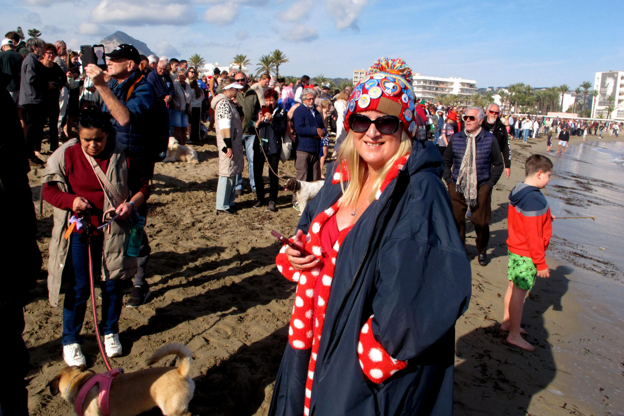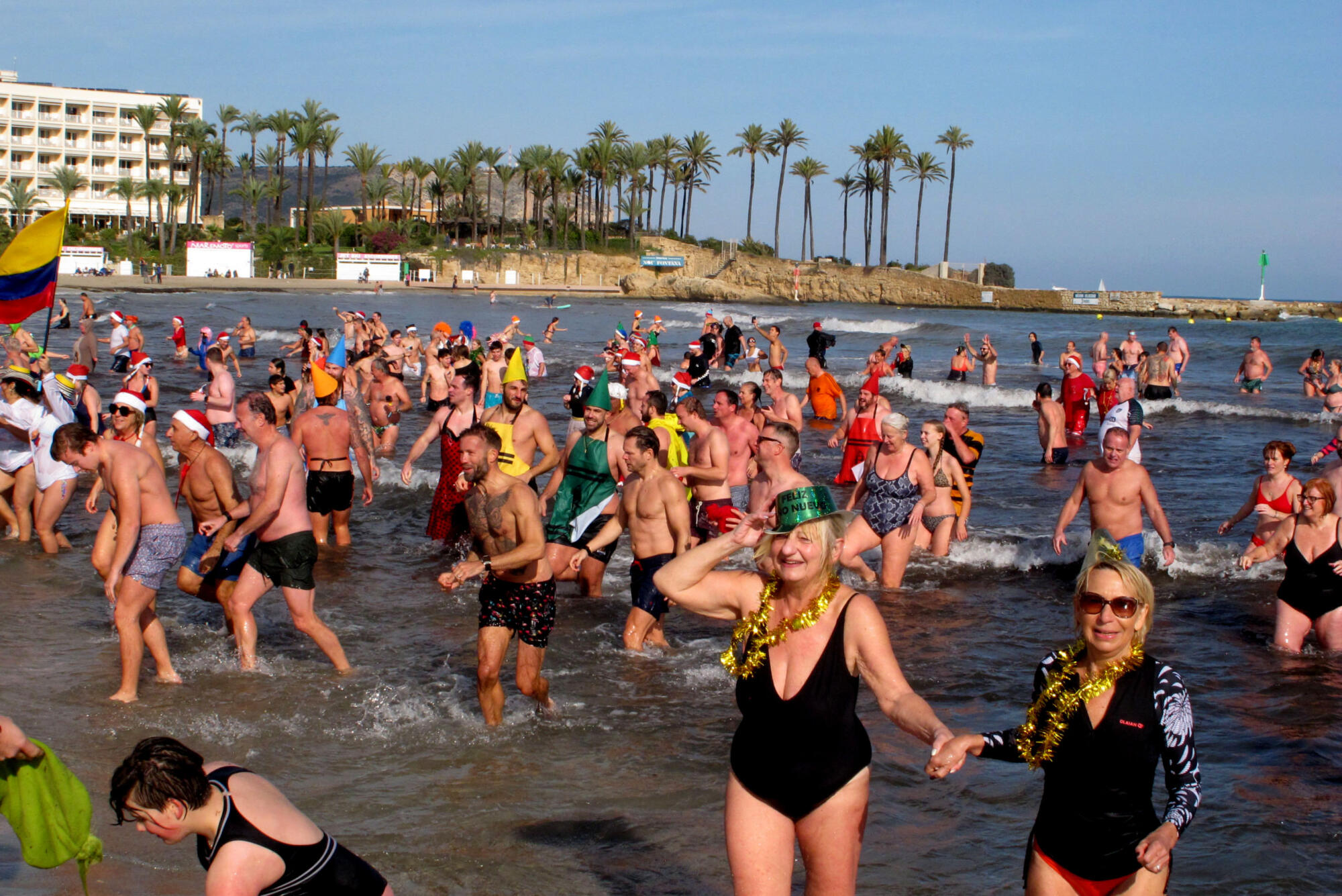 Fieles a la tradicional cita de nuevo año, unas 200 personas se zambulleron en las aguas de la playa de El Arenal en Xàbia, el jueves 1 de enero de 2026.