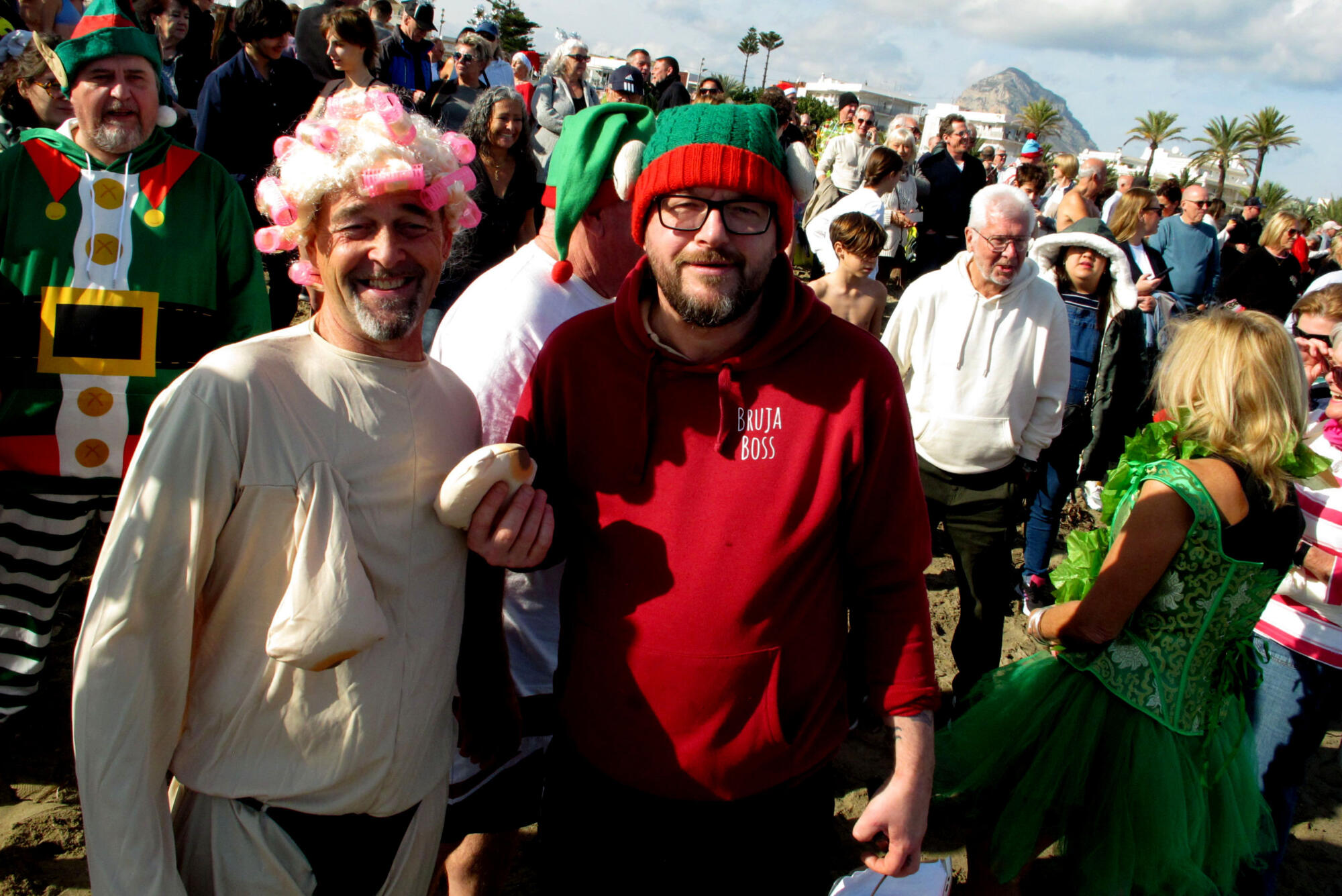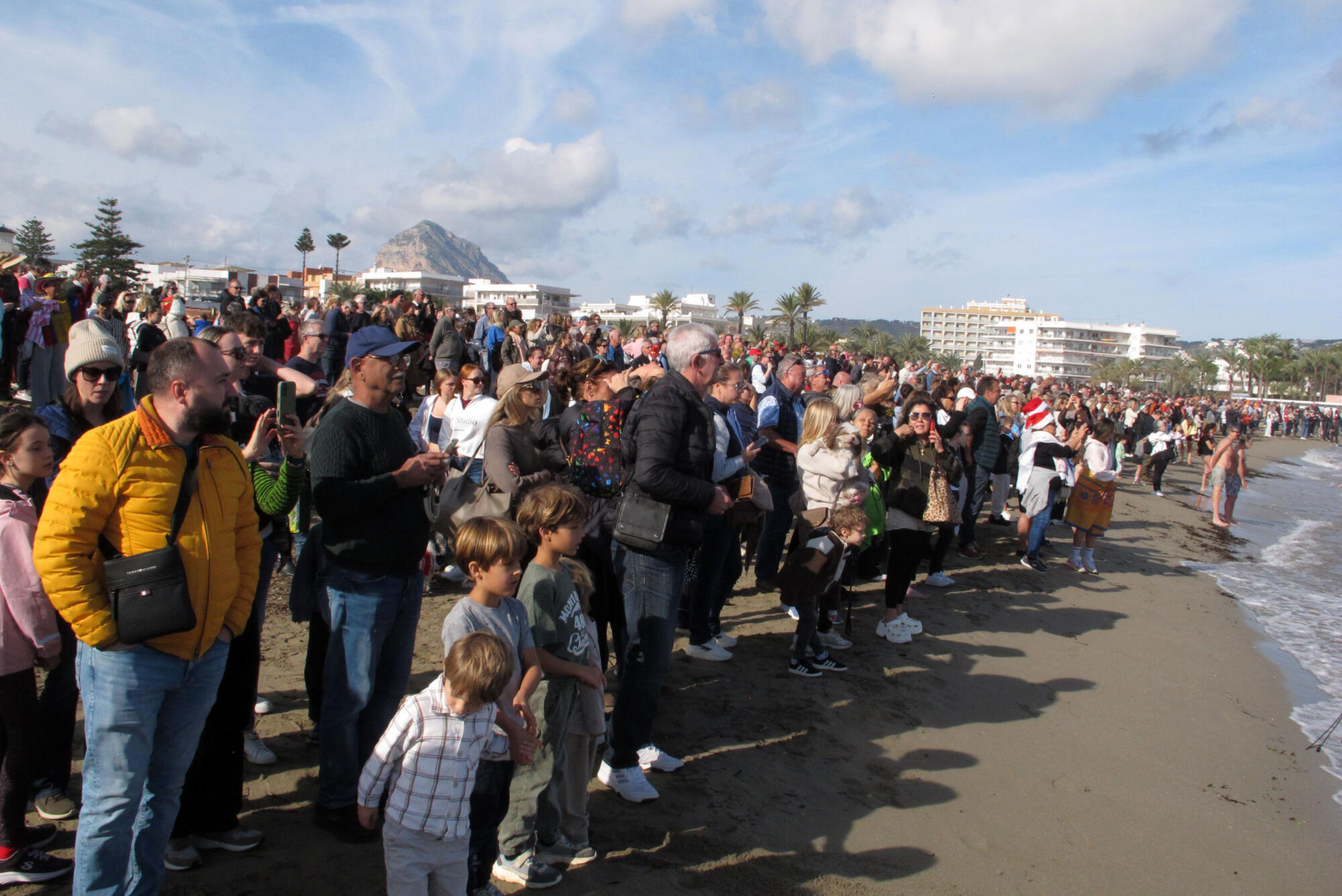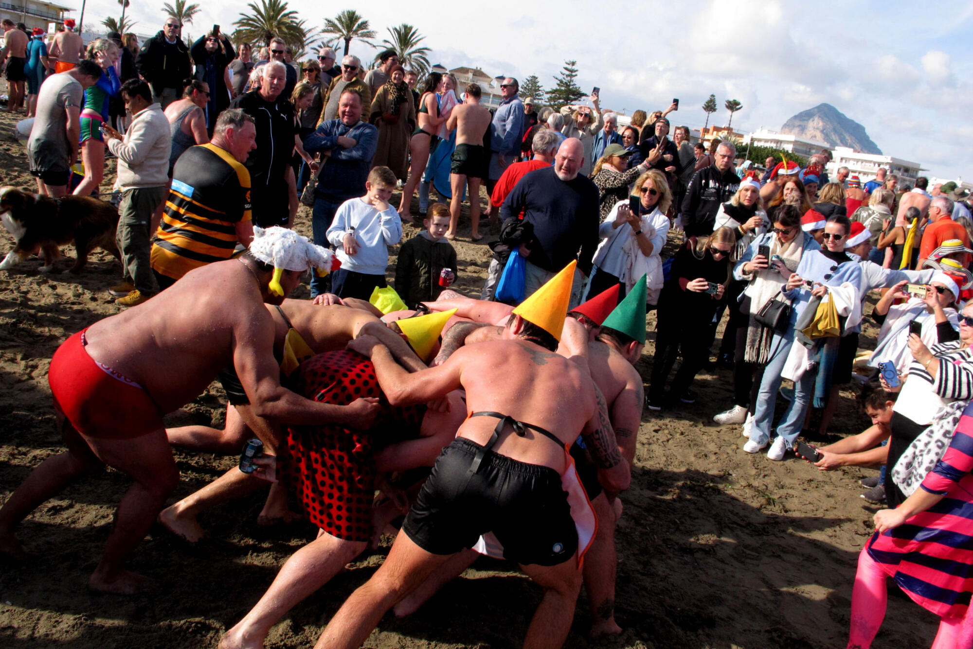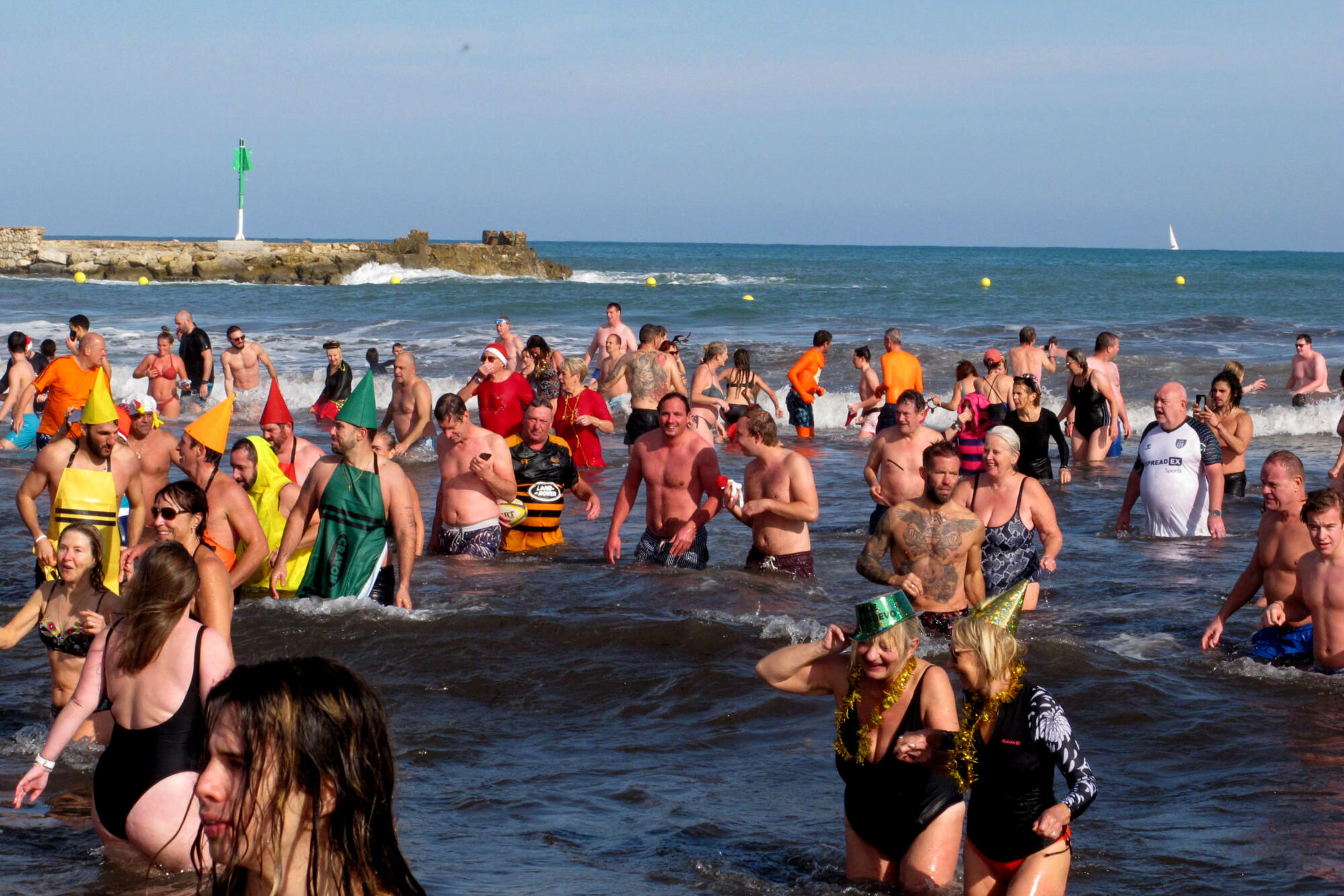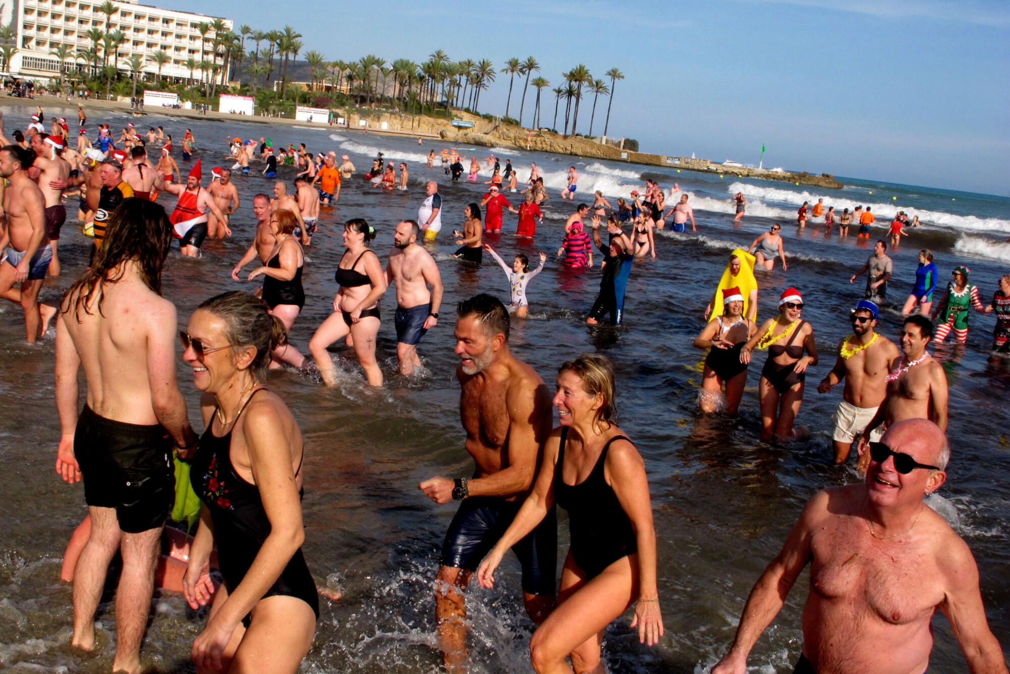 Fieles a la tradicional cita de nuevo año, unas 200 personas se zambulleron en las aguas de la playa de El Arenal en Xàbia, el jueves 1 de enero de 2026.