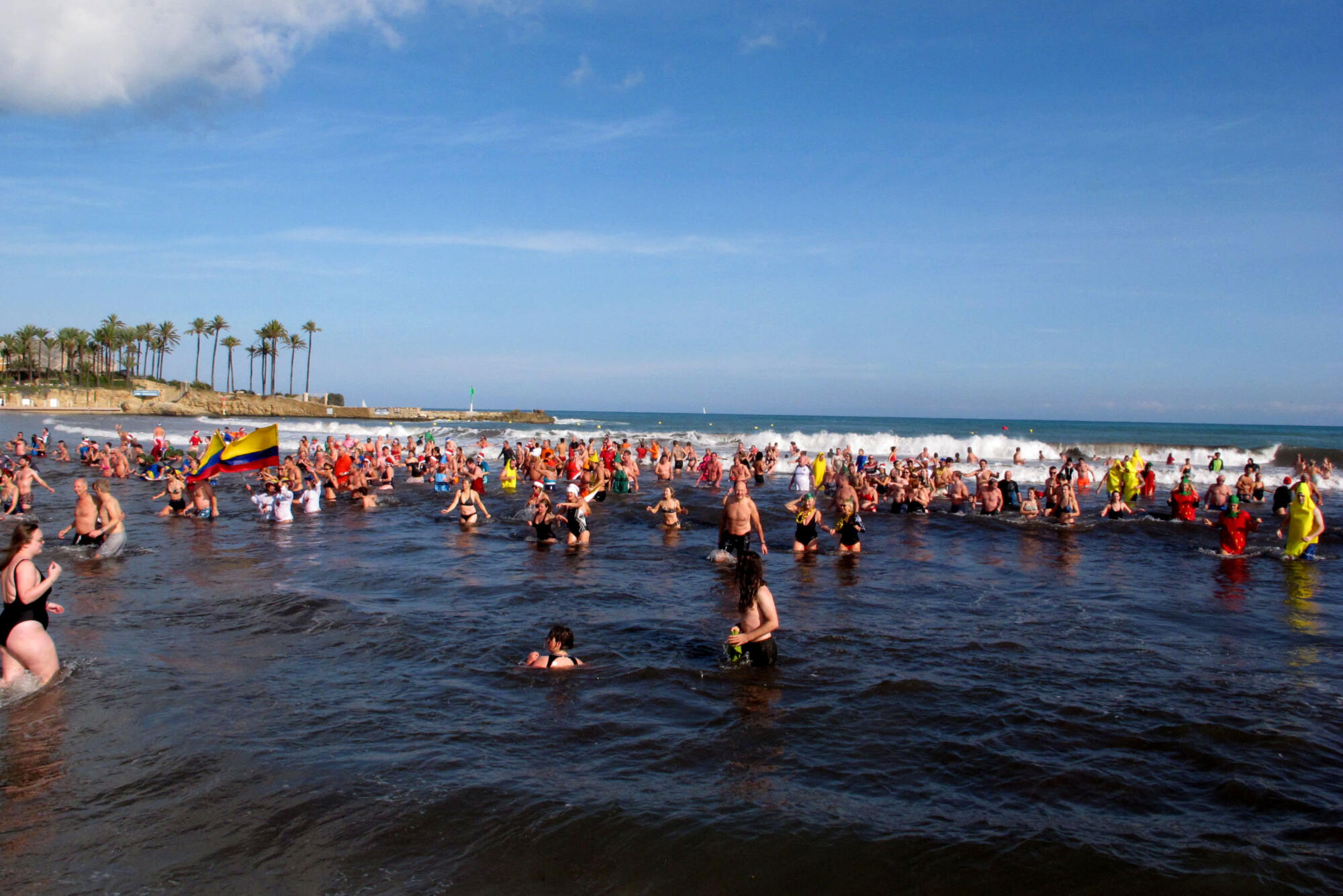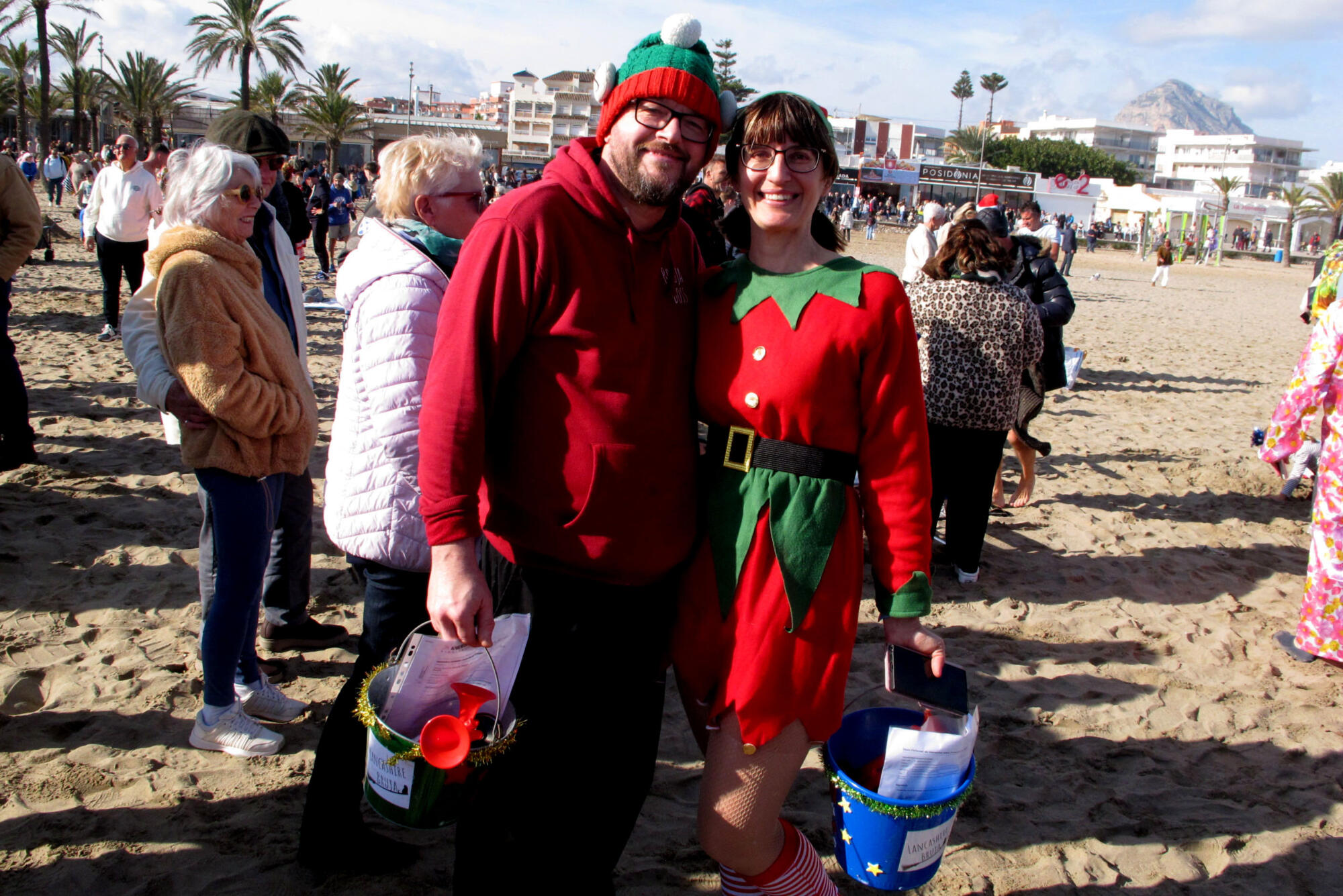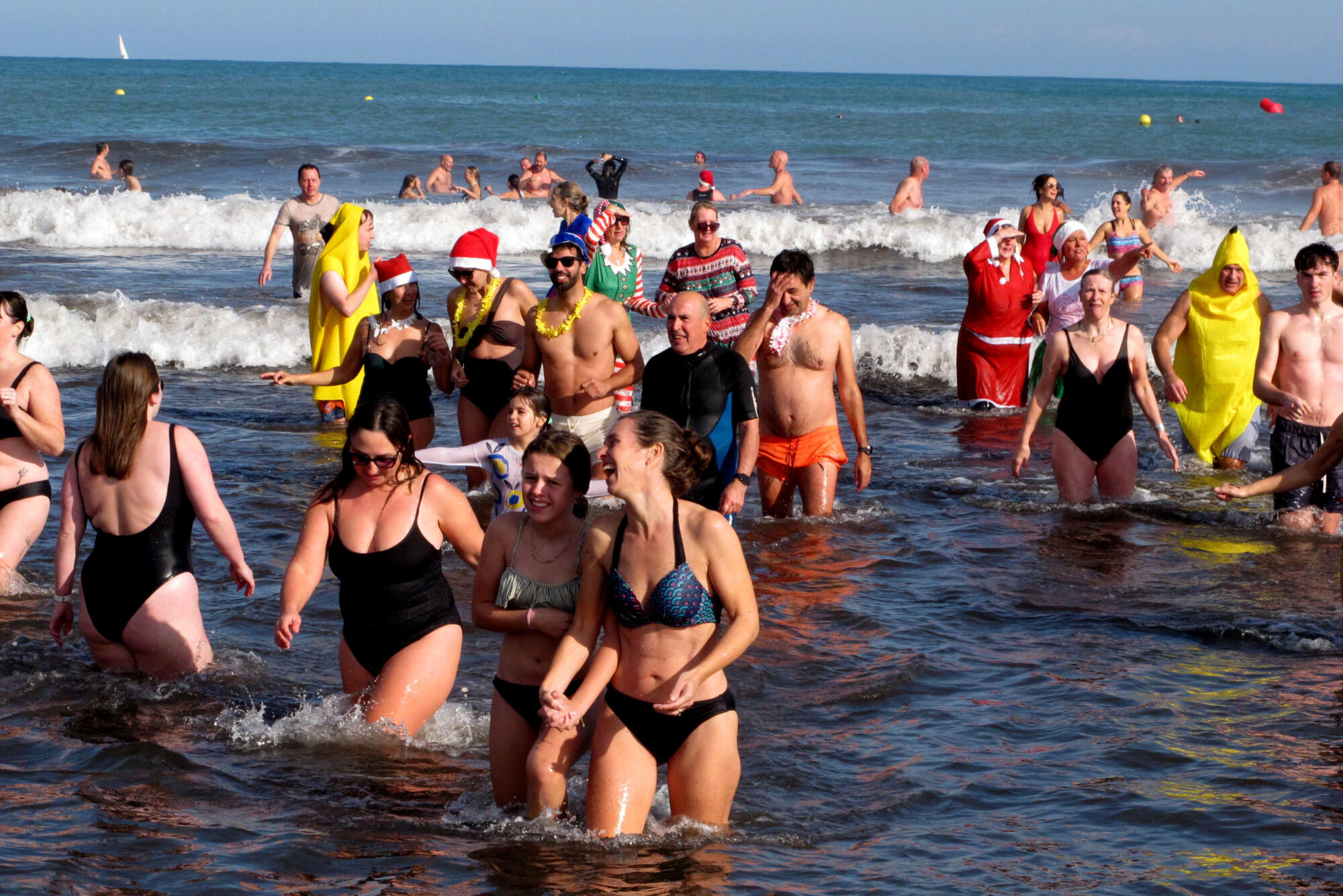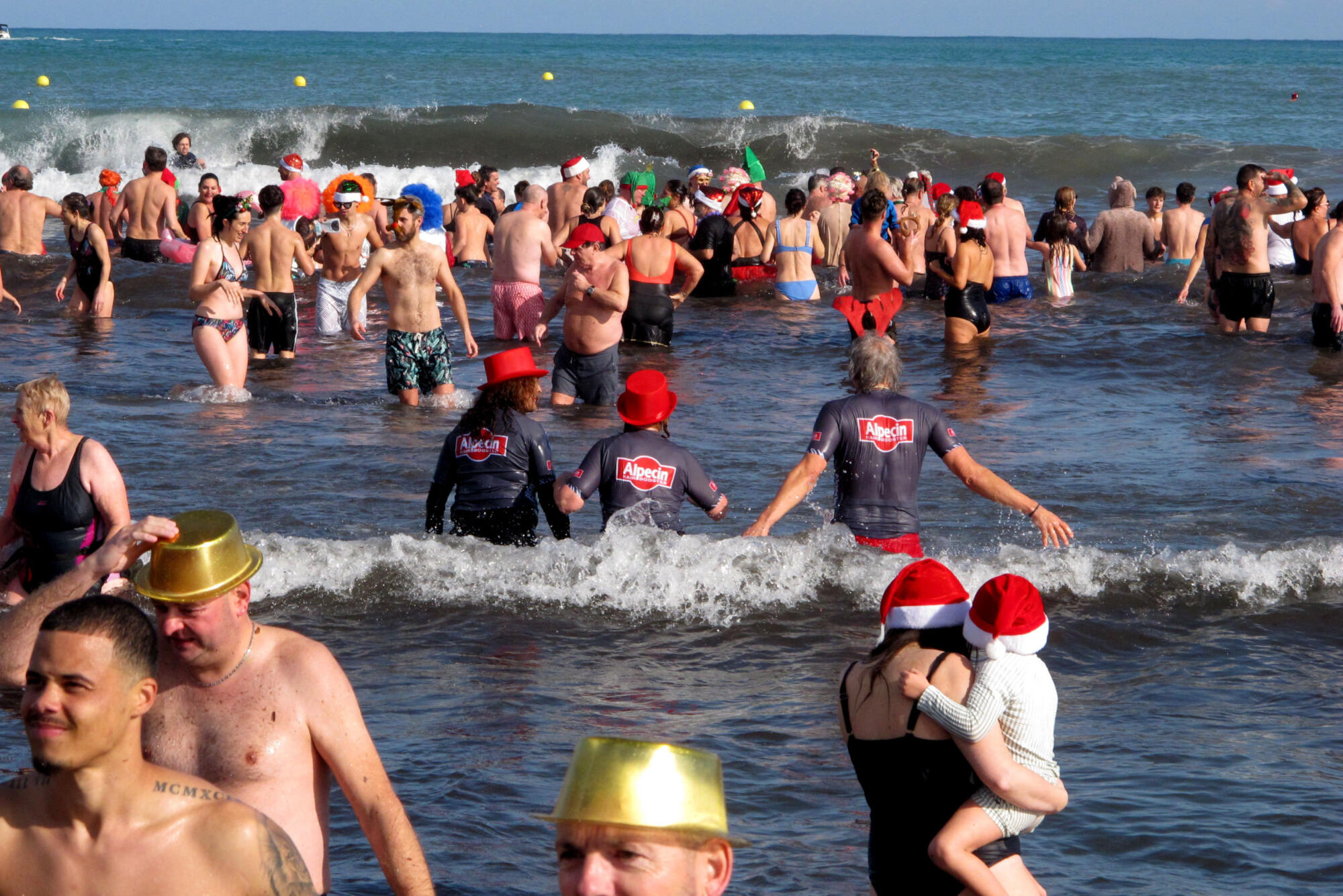 Fieles a la tradicional cita de nuevo año, unas 200 personas se zambulleron en las aguas de la playa de El Arenal en Xàbia, el jueves 1 de enero de 2026.