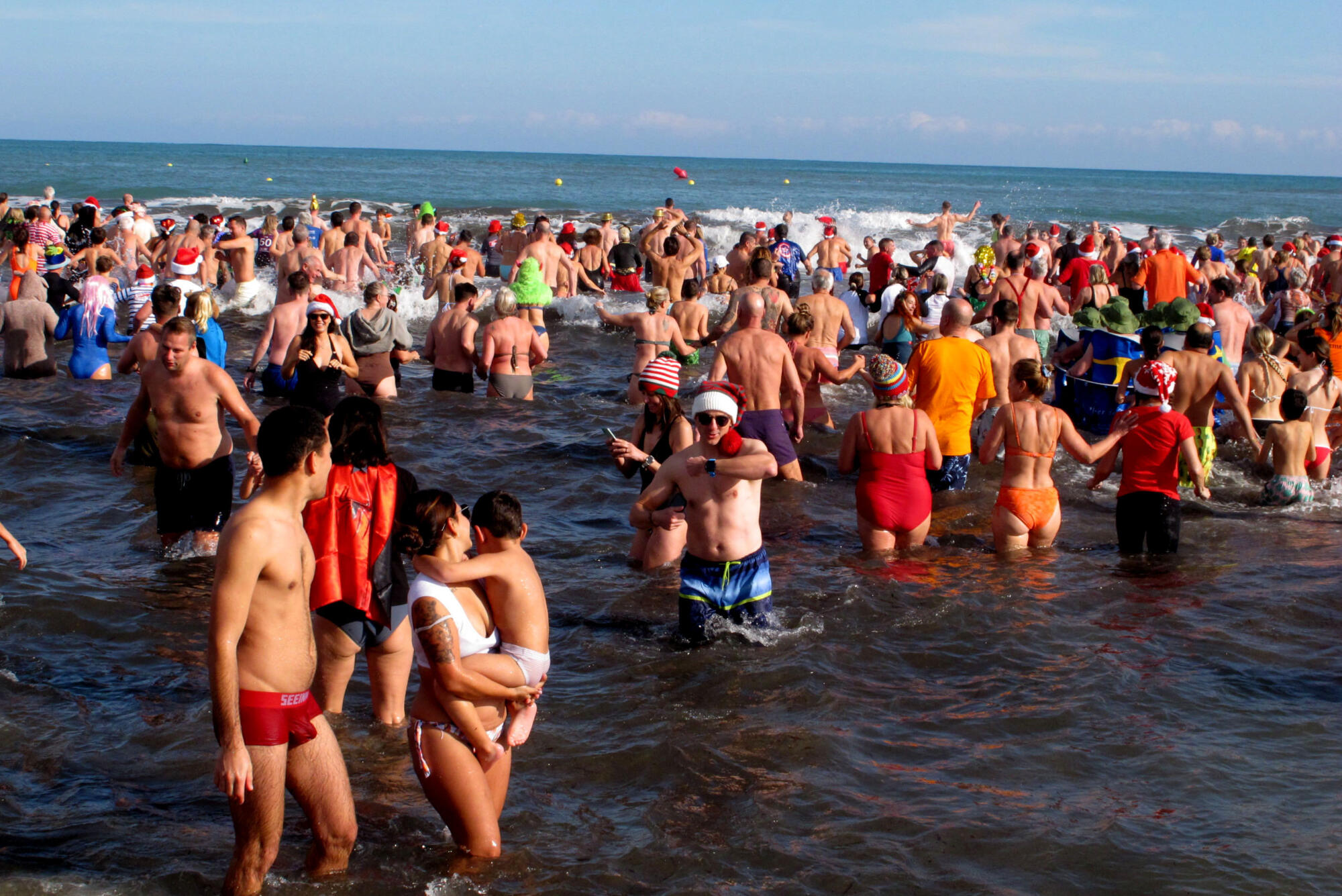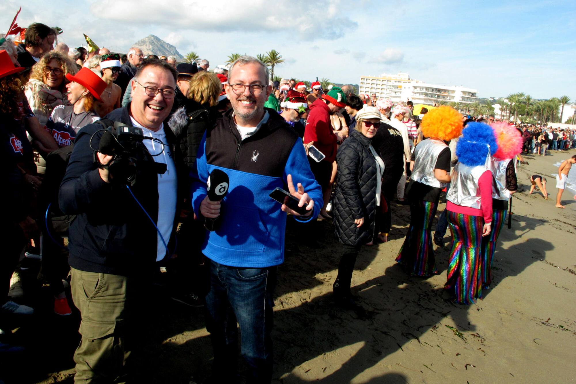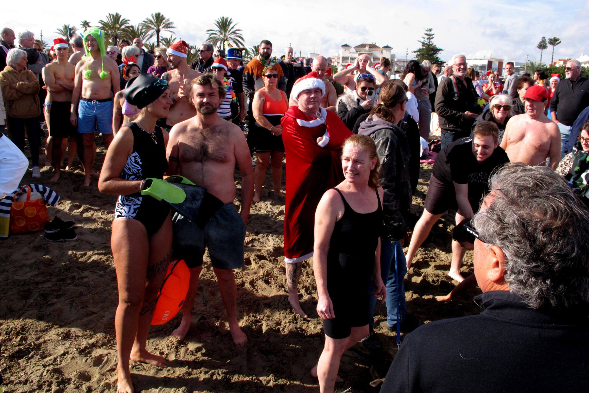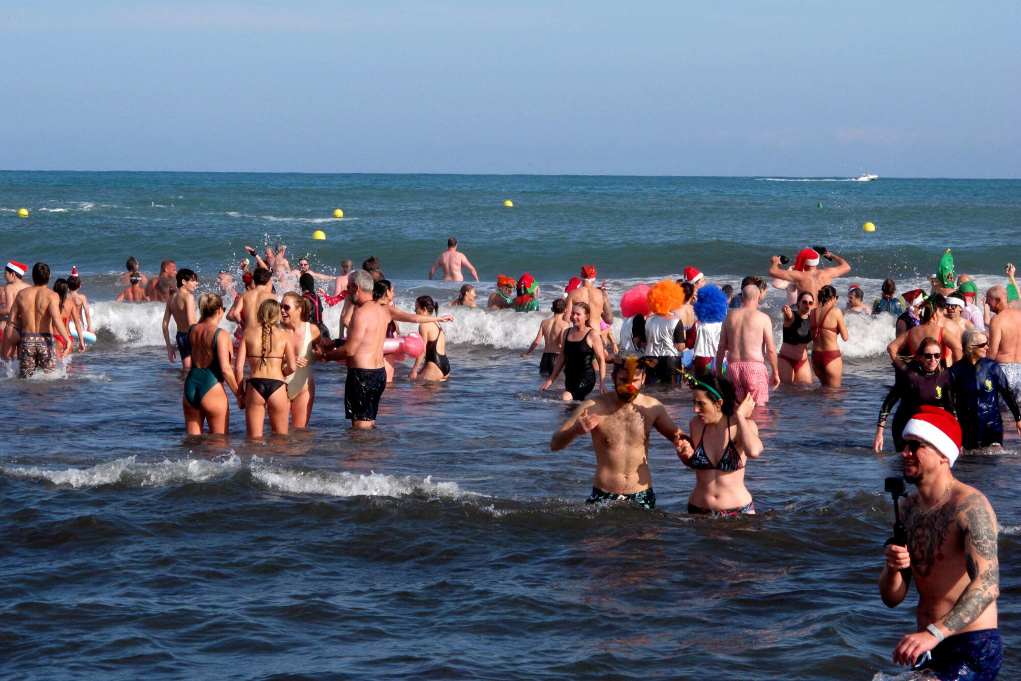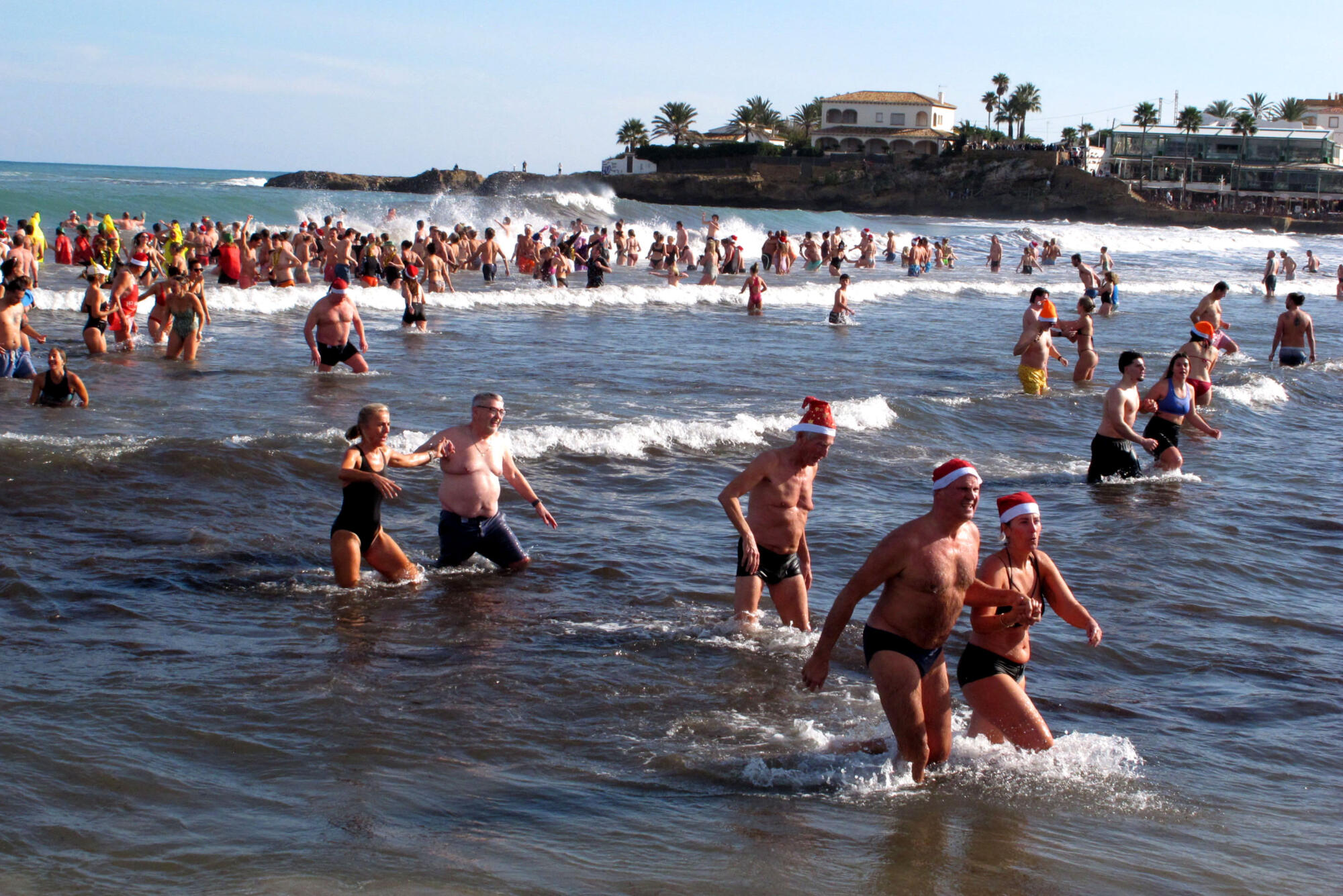 Fieles a la tradicional cita de nuevo año, unas 200 personas se zambulleron en las aguas de la playa de El Arenal en Xàbia, el jueves 1 de enero de 2026.