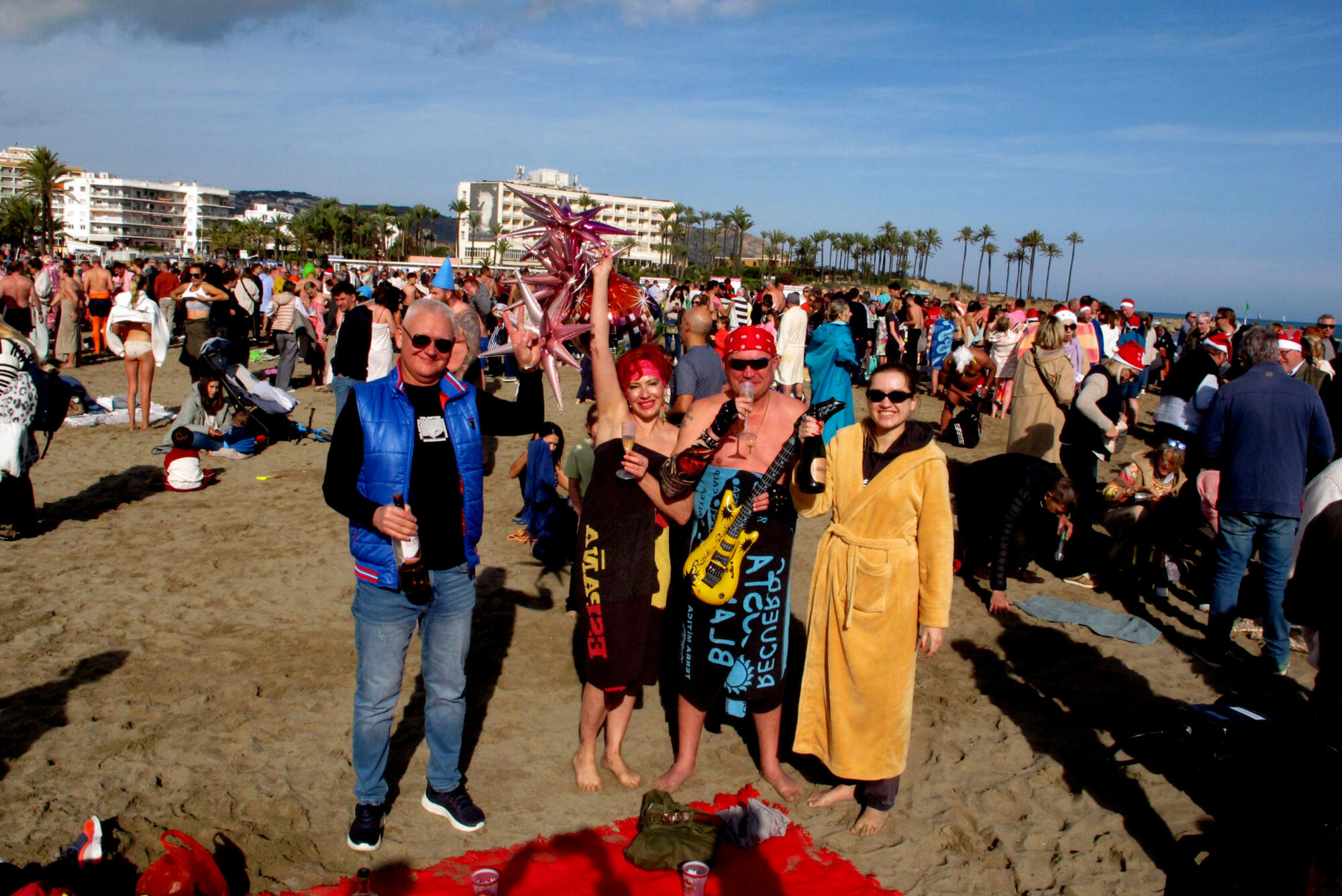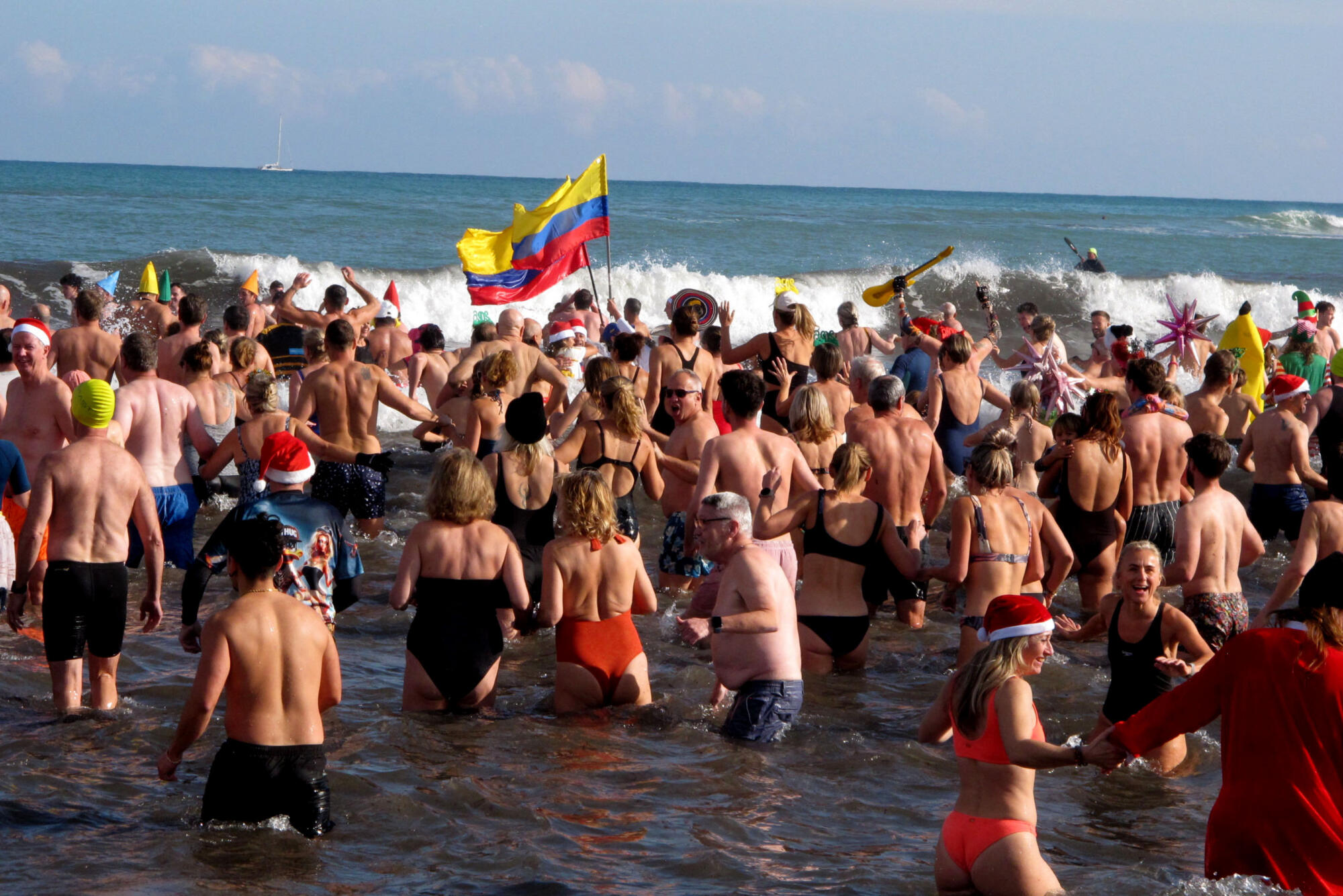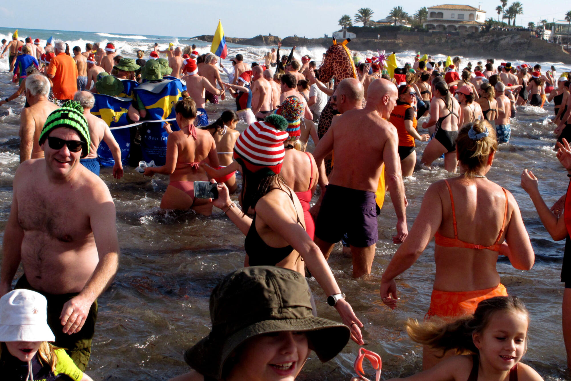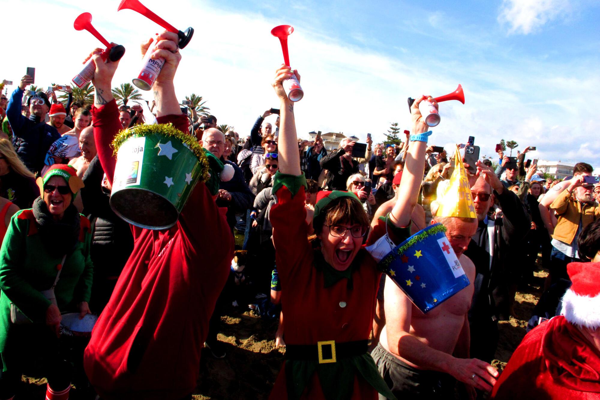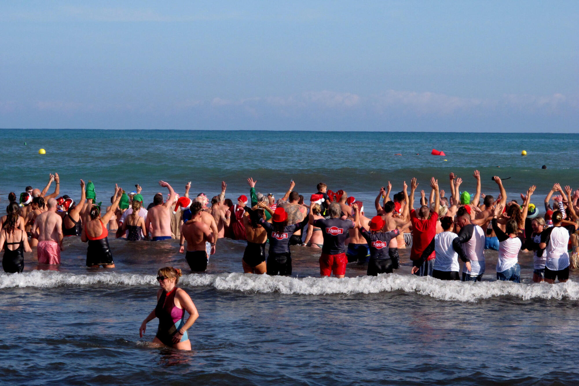 Fieles a la tradicional cita de nuevo año, unas 200 personas se zambulleron en las aguas de la playa de El Arenal en Xàbia, el jueves 1 de enero de 2026.