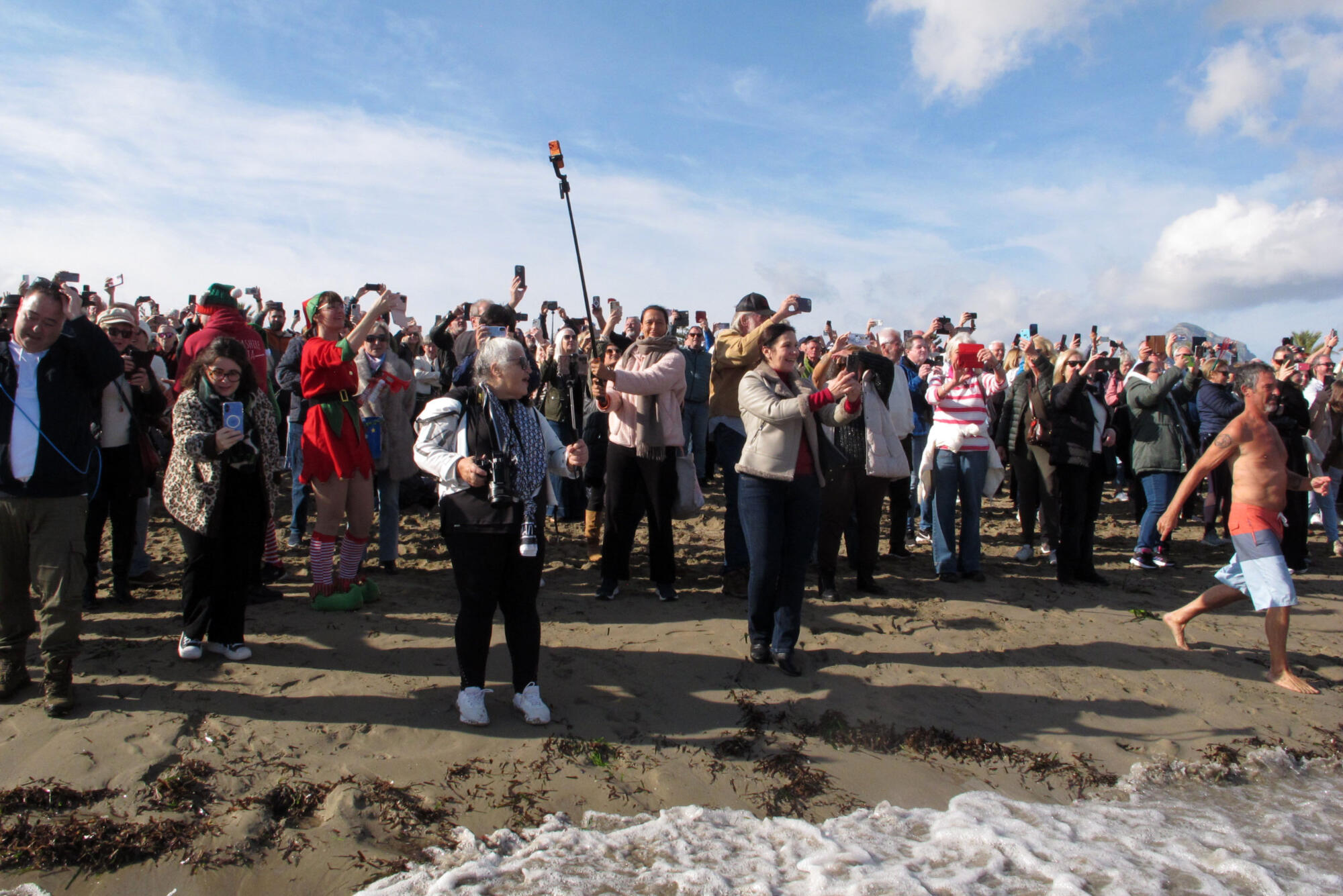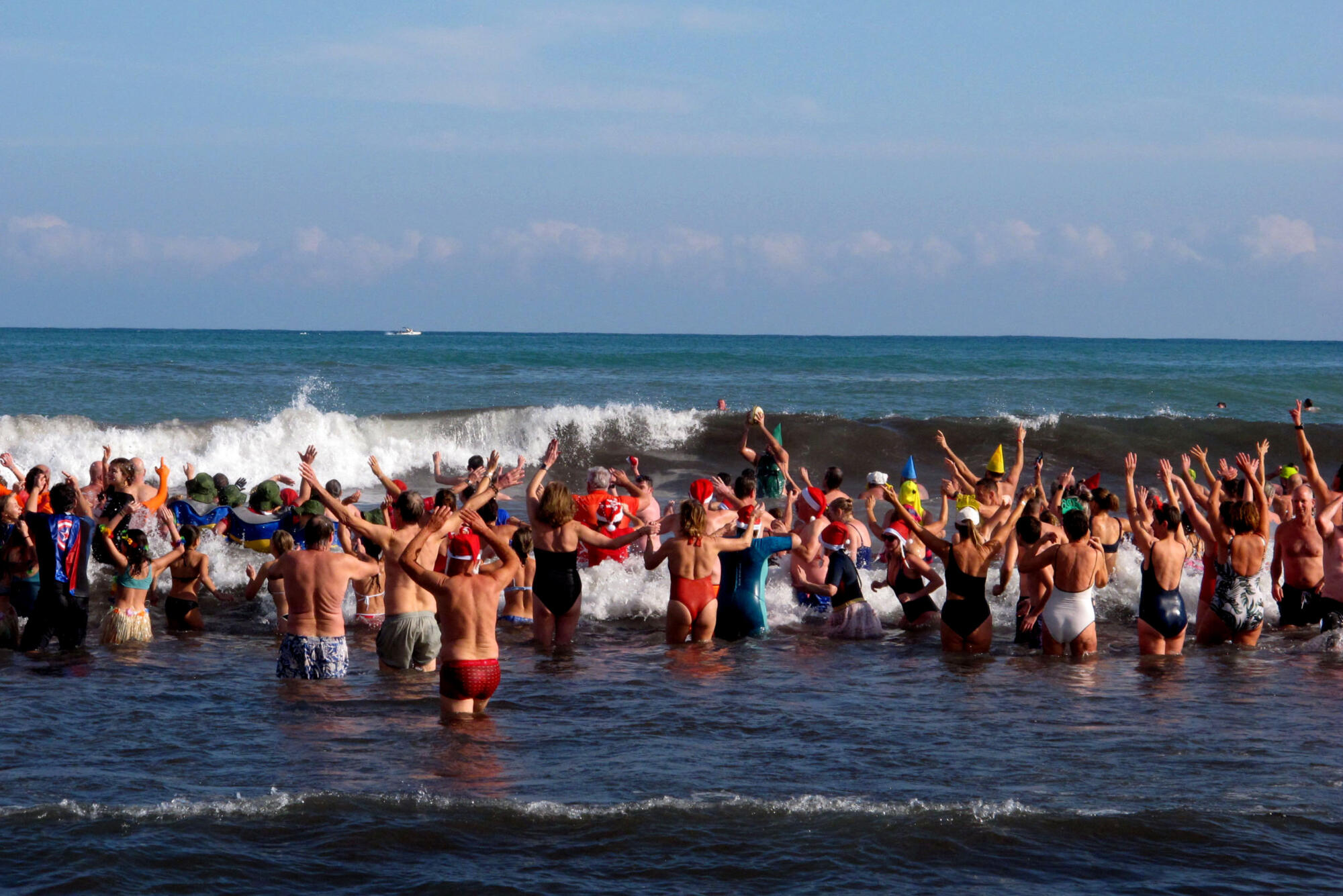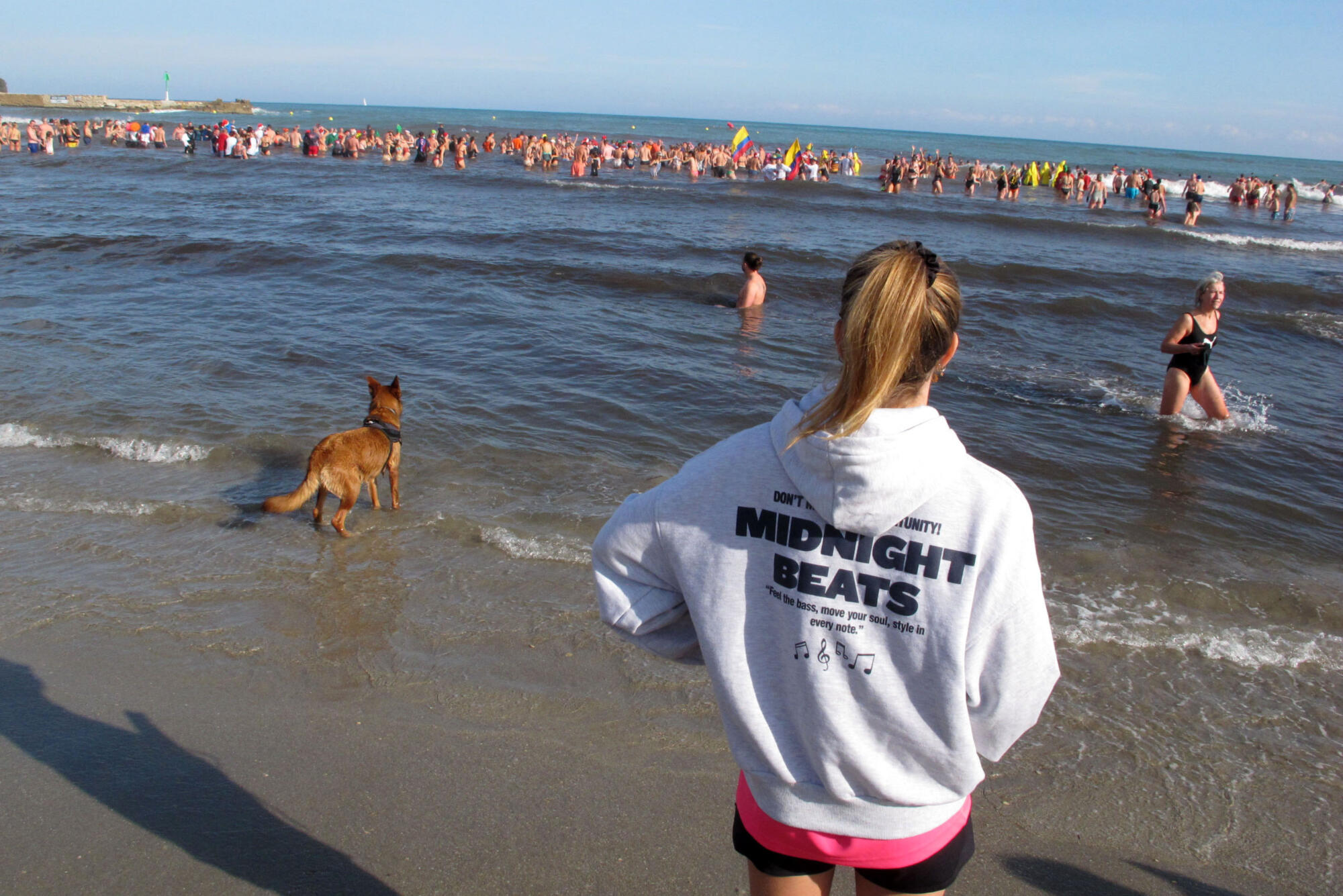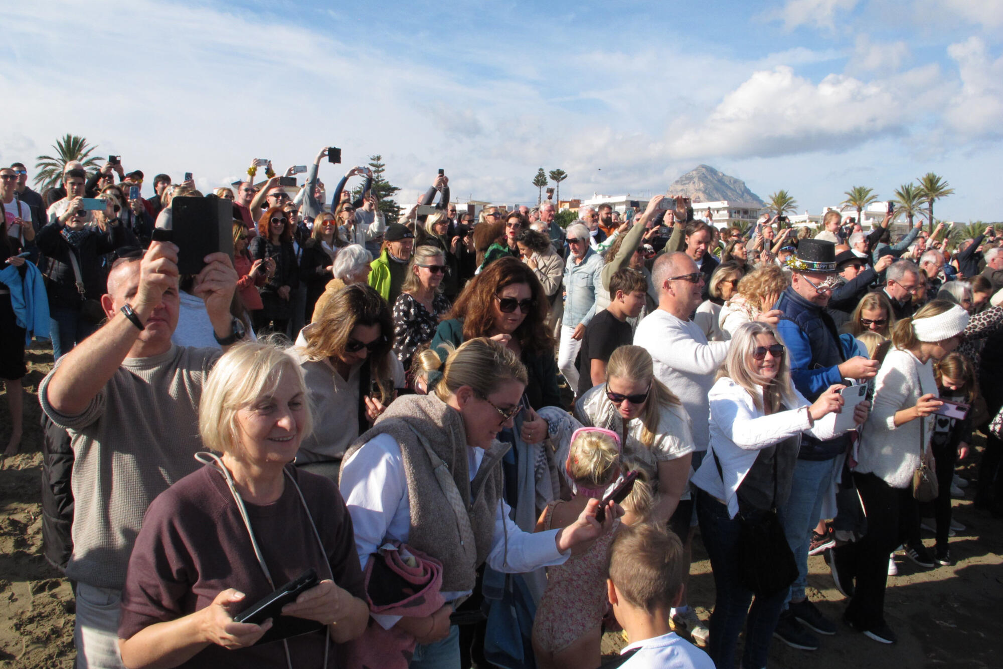Fieles a la tradicional cita de nuevo año, unas 200 personas se zambulleron en las aguas de la playa de El Arenal en Xàbia, el jueves 1 de enero de 2026.