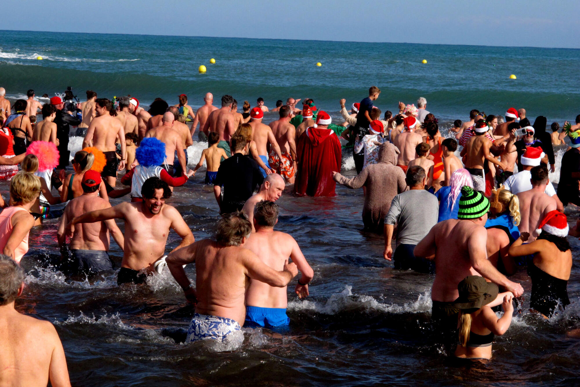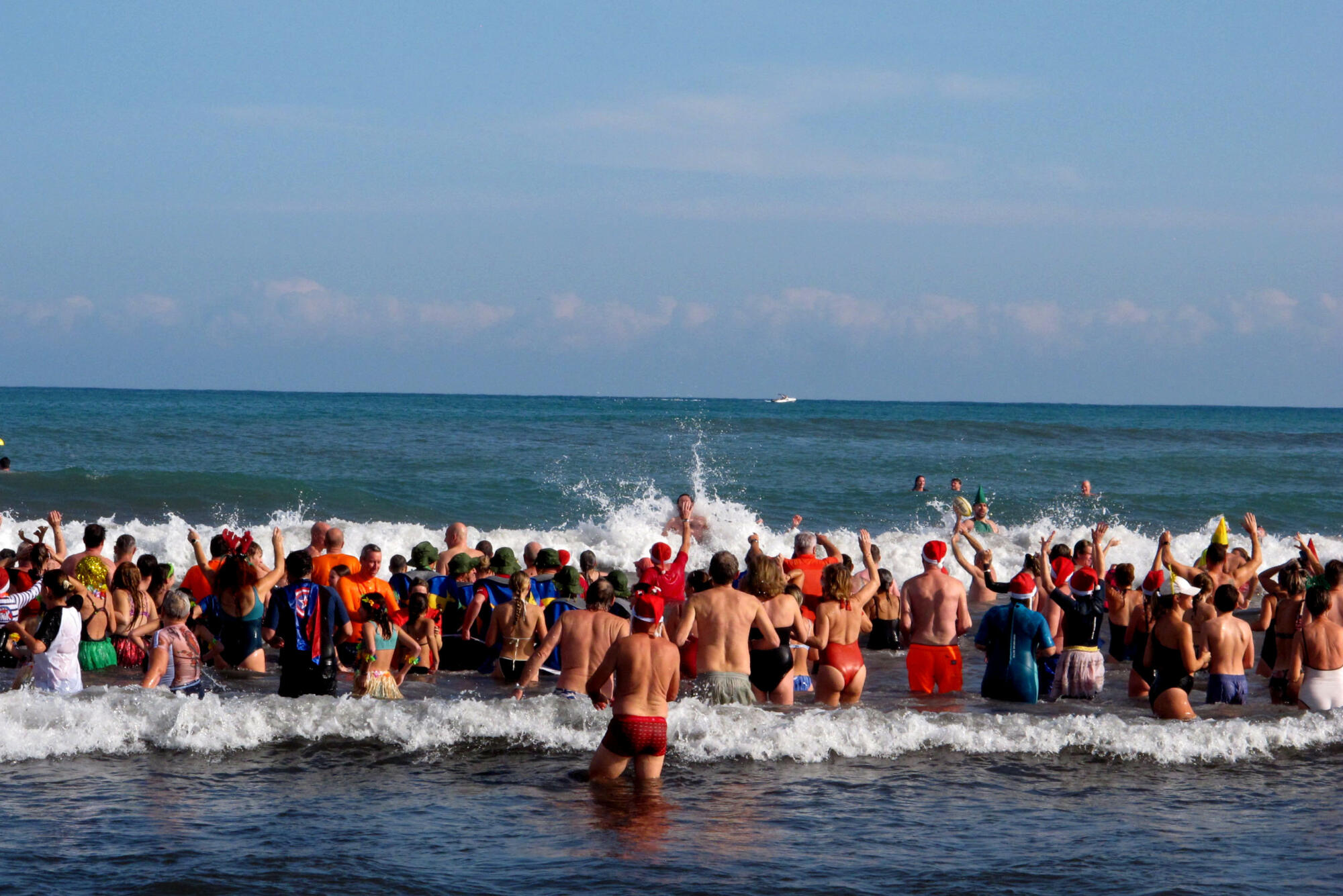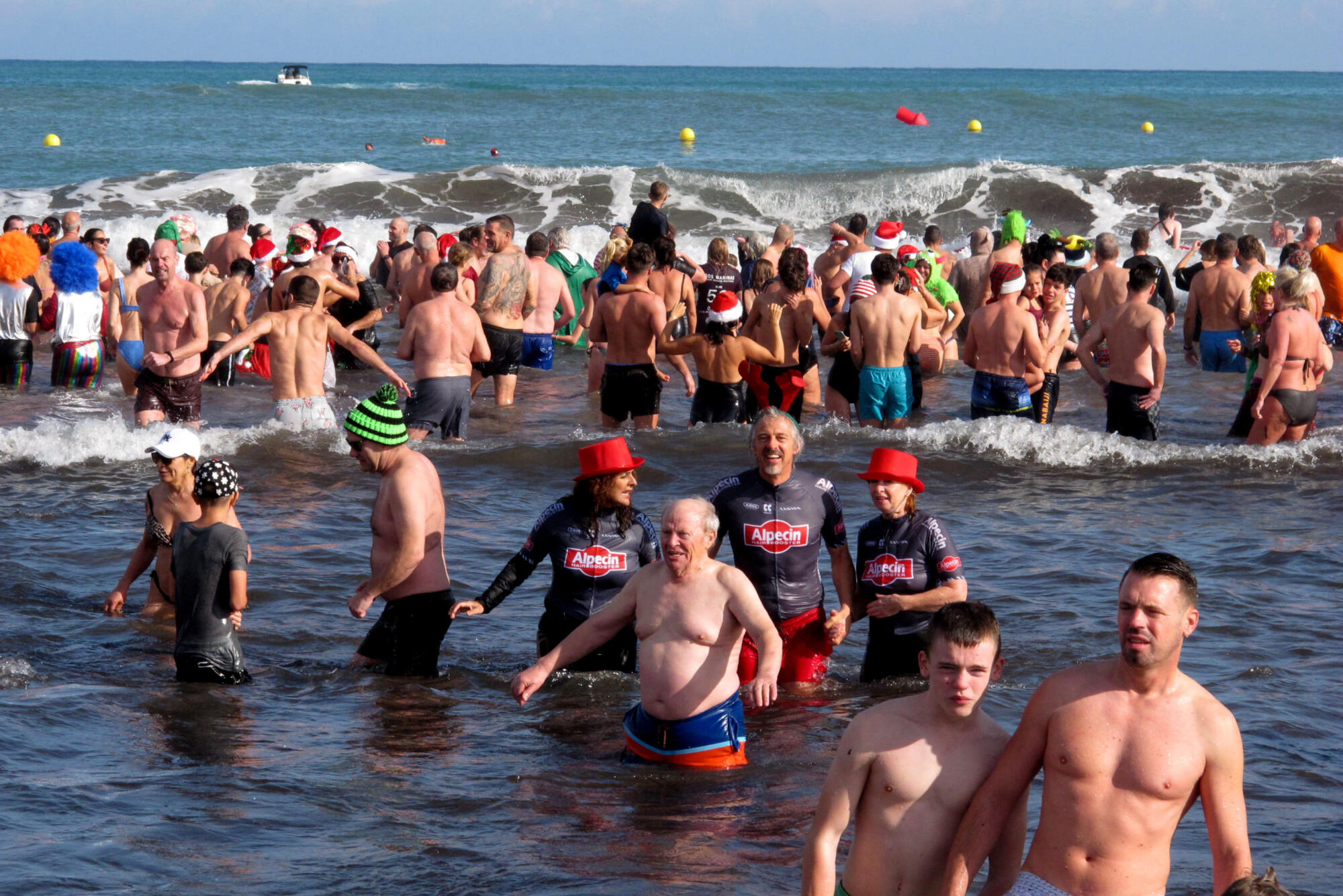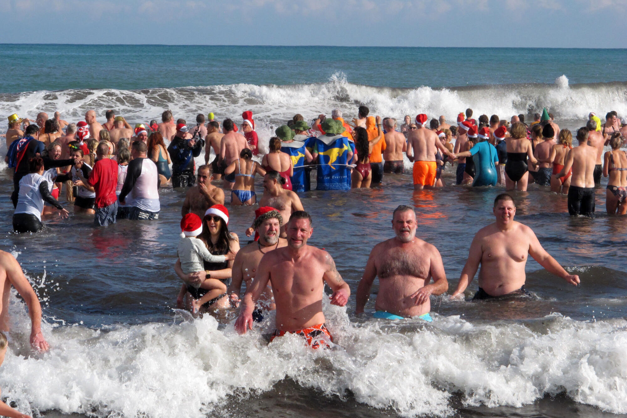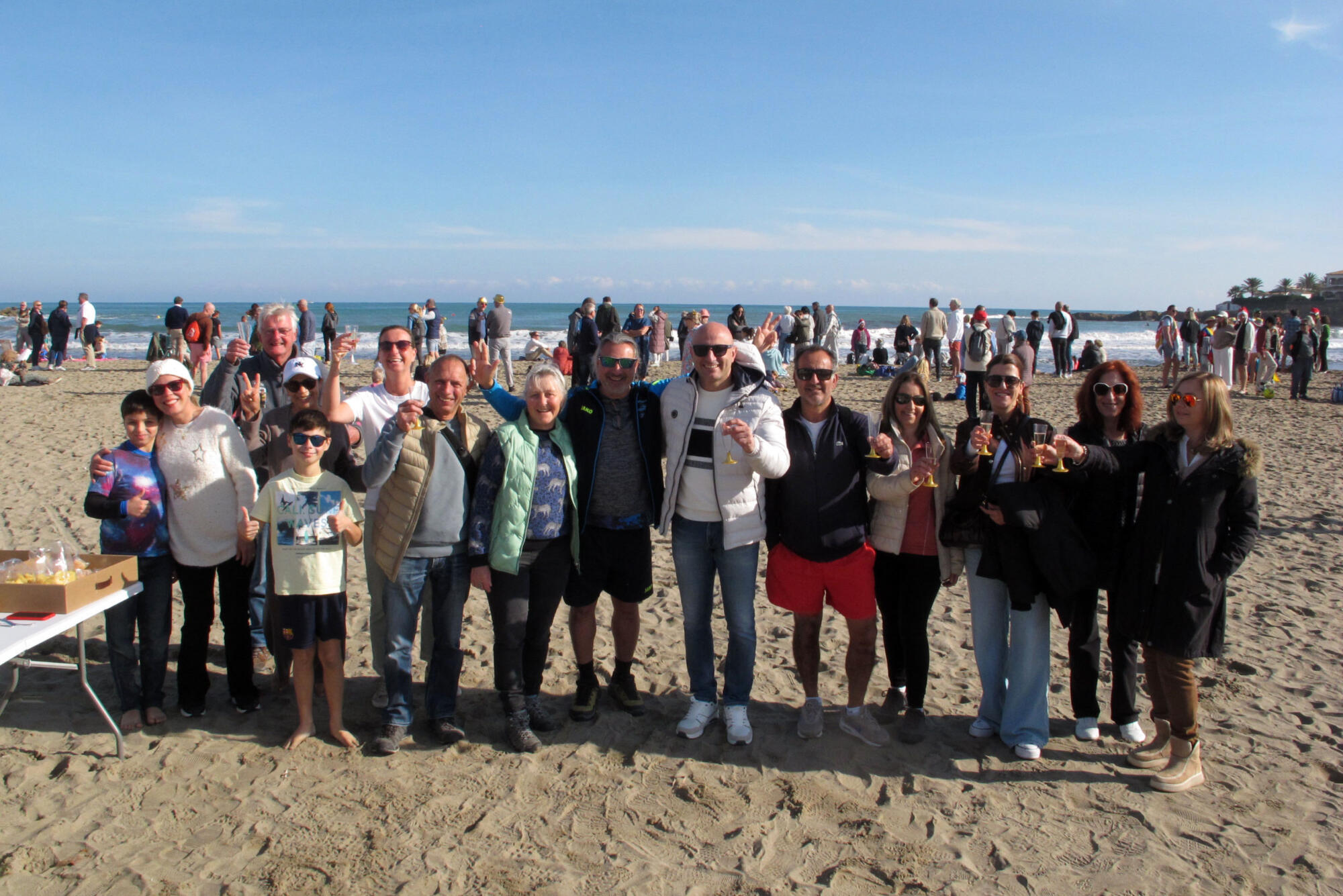 Fieles a la tradicional cita de nuevo año, unas 200 personas se zambulleron en las aguas de la playa de El Arenal en Xàbia, el jueves 1 de enero de 2026.
