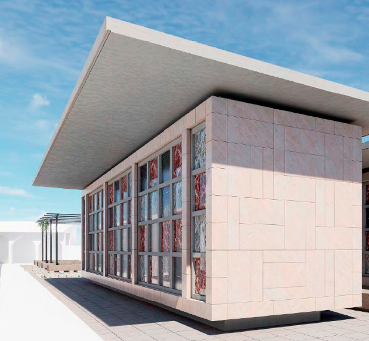 El trabajo contempla la construcción de un nuevo pabellón exento, situado en el segundo recinto perimetral del cementerio, siguiendo el modelo de organización implementado en intervenciones previas. Este pabellón se presenta como un prisma arquitectónico rectangular que albergará 56 nuevos nichos distribuidos eficientemente en 14 columnas y 4 filas.