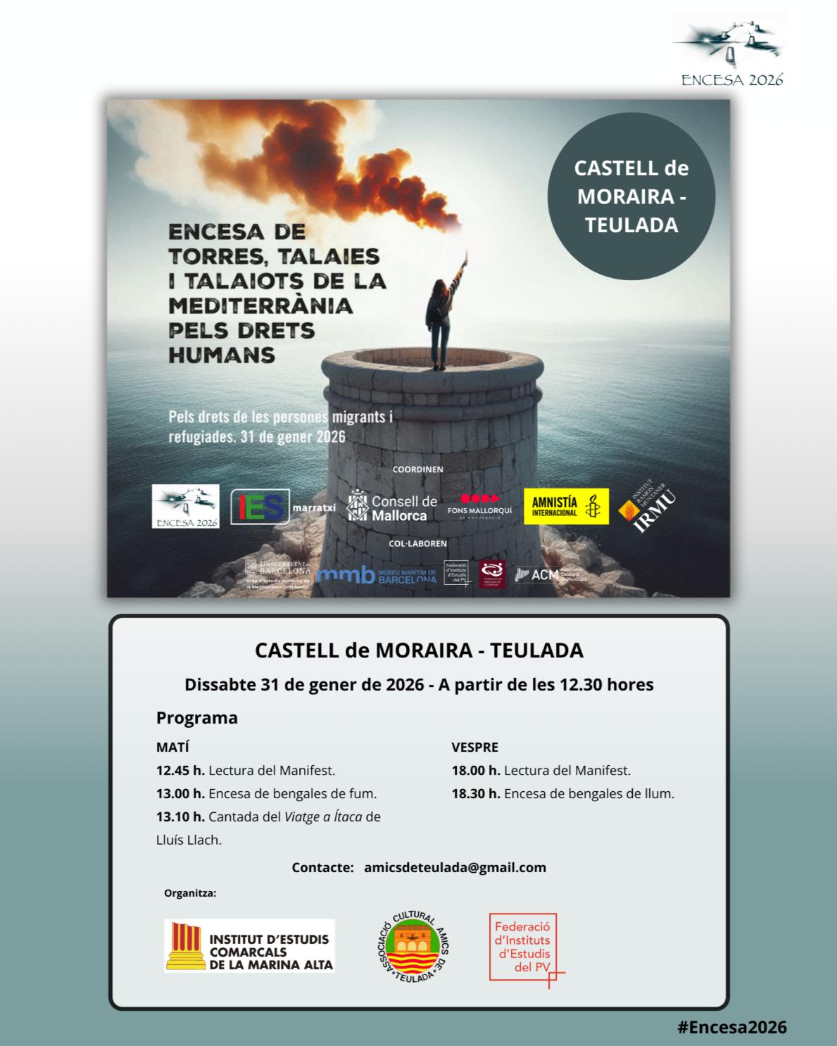 La explanada del Castell de Moraira acogerá el próximo sábado 31 de enero una nueva edición de la Encesa de Torres, Talaies i Talaiots pels Drets Humans i el Patrimoni, una iniciativa de carácter cultural y reivindicativo que abre el calendario anual de actividades de la Associació Cultural Amics de Teulada (ACAT), en colaboración con el Institut d’Estudis Comarcals de la Marina Alta.