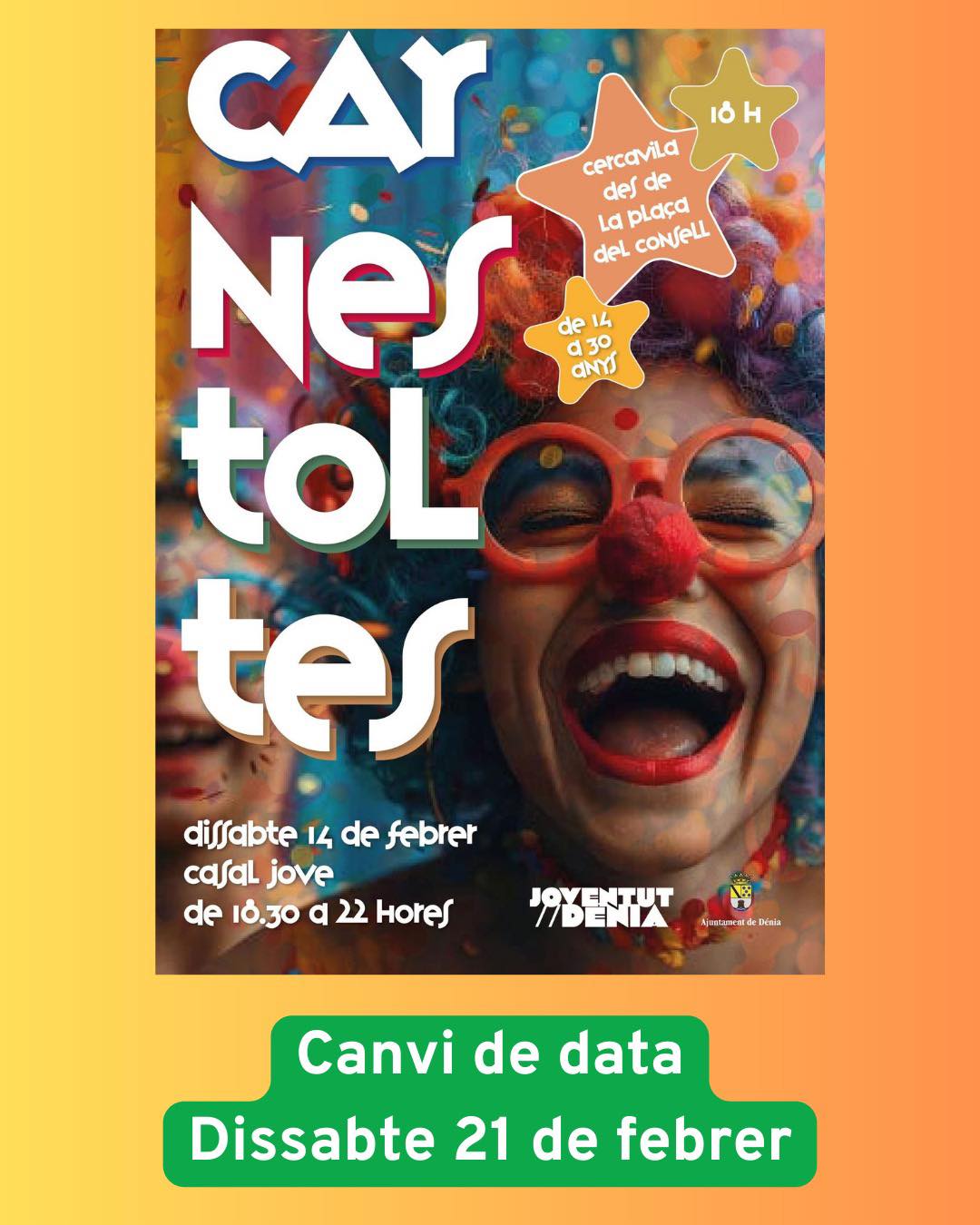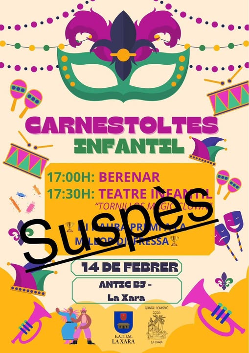 – Queda suspendida la actividad de Juventud del Casal Jove. El Carnaval Joven se aplaza al sábado 21 de febrero con la programación prevista: Batucada, Concurso de disfraces, Karaoke y un photocall 360.