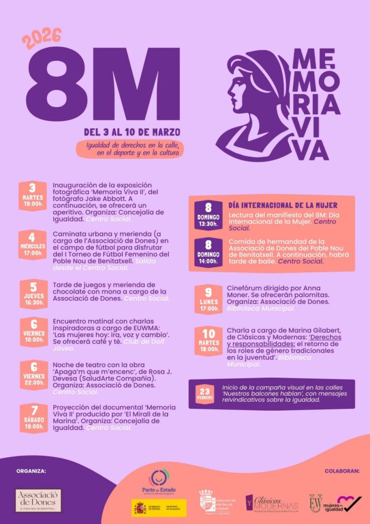 El Poble Nou de Benitatxell se convierte en un punto de encuentro para la reivindicación de los derechos de las mujeres por la celebración del Día Internacional de la Mujer, el próximo 8M. En esta ocasión, la Concejalía de Igualdad, junto con la Associació de Dones, la European Union of Women Marina Alta, Clásicas y Modernas, la Biblioteca Municipal y la Escuela Municipal de Fútbol Base, han preparado una variada programación que se llevará a cabo del 3 al 10 de marzo.