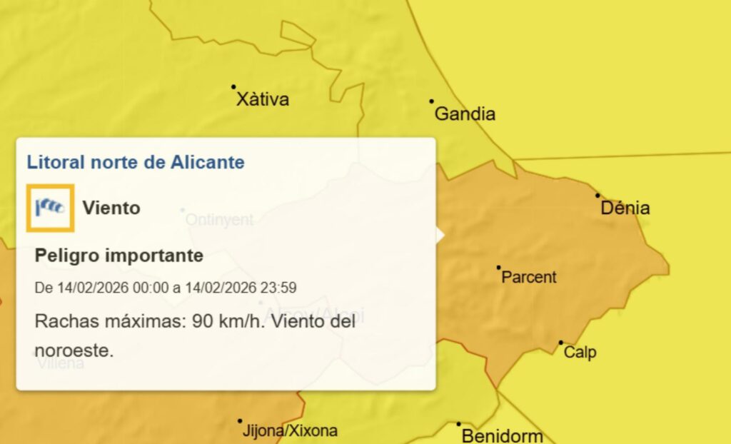La situación se complica de cara al sábado, cuando la AEMET eleva el aviso a nivel naranja por viento en el litoral norte de Alicante. El episodio permanecerá activo desde la medianoche hasta las 23:59 horas, con rachas que podrían alcanzar los 90 km/h y un viento predominante del noroeste.