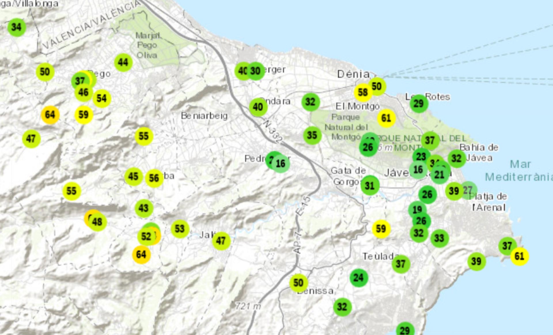 En la Vall d’Ebo, por ejemplo, se han registrado 64 km/h, en Benigembla, Dénia, Xàbia o Pego cerca de los 60 km/h, mientras que en Castells de Castells ya recogemos los 50 km/h.