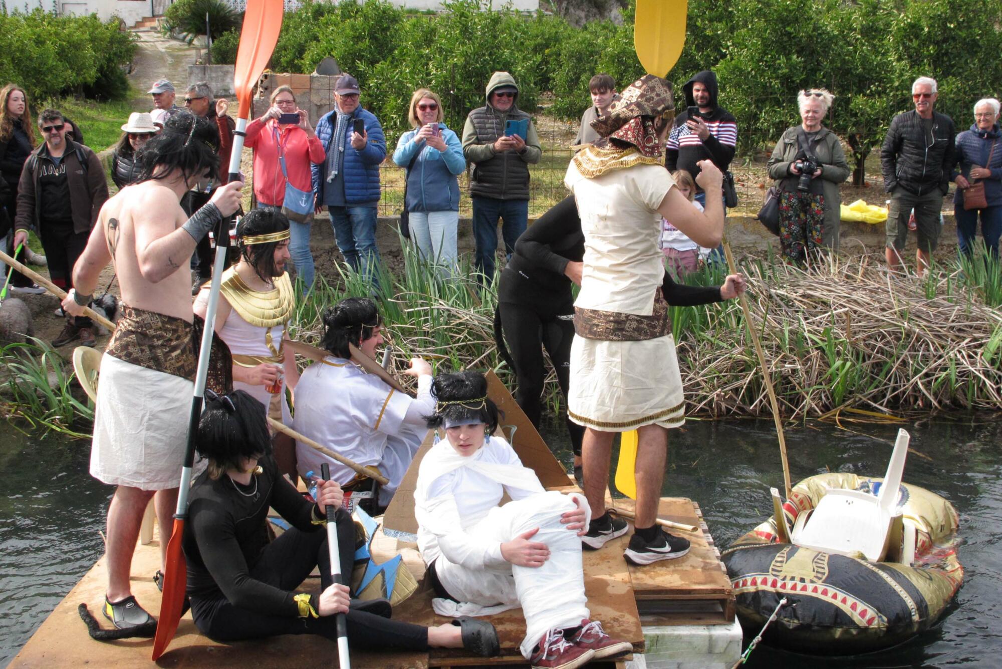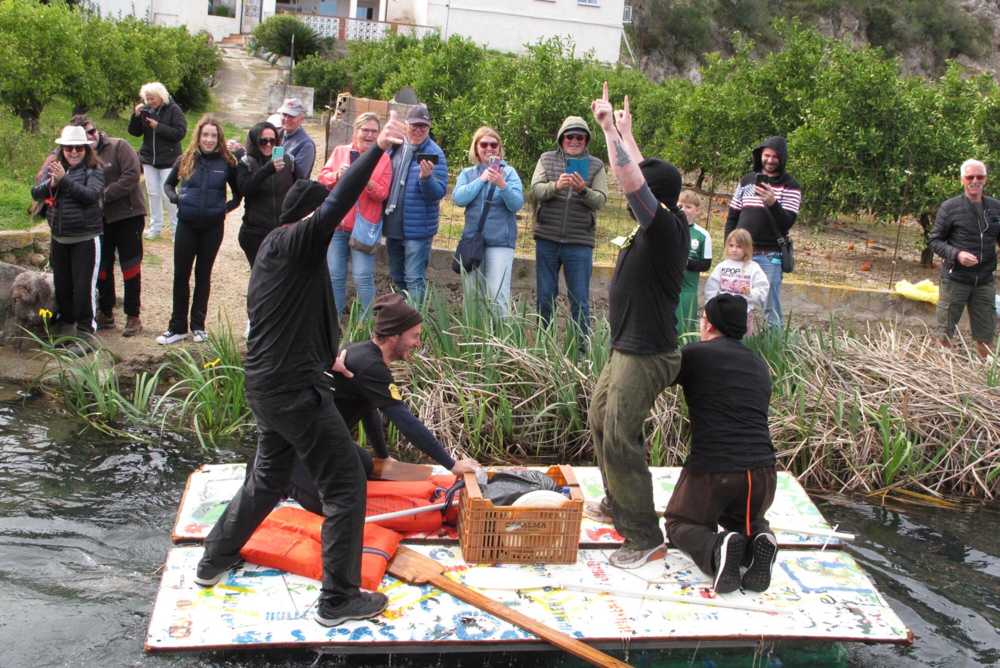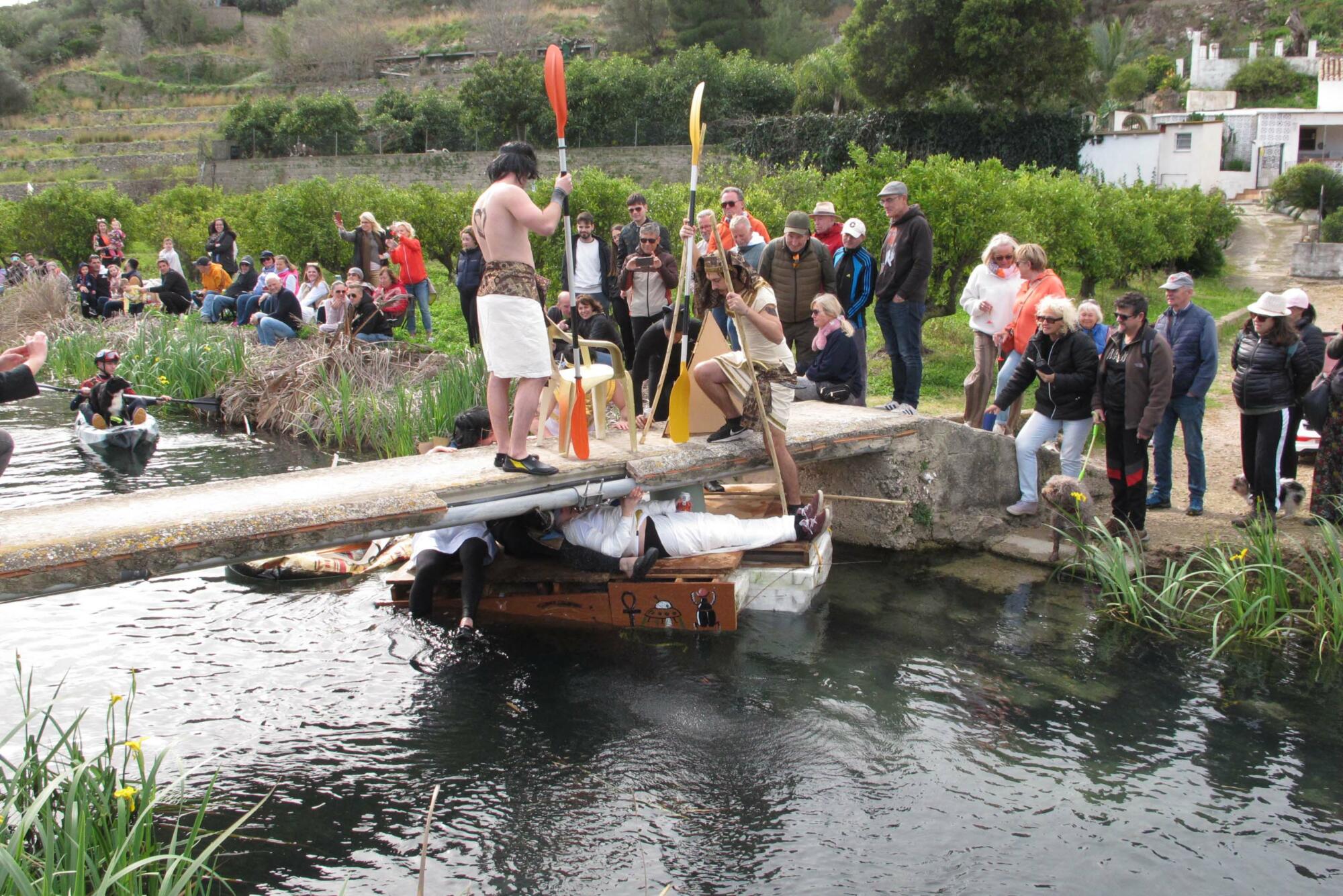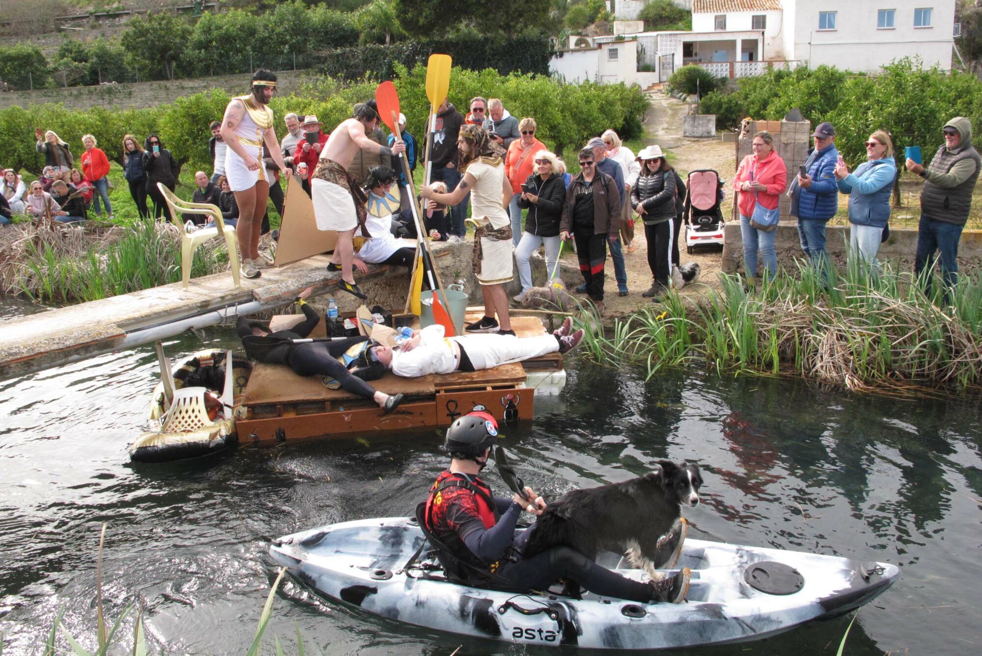 Una atípica carrera de embarcaciones caseras que «surcan» las aguas del río Bullent, por el paraje de la Marjal de Pego-Oliva, ante la atenta y divertida mirada del público que se congrega alrededor.