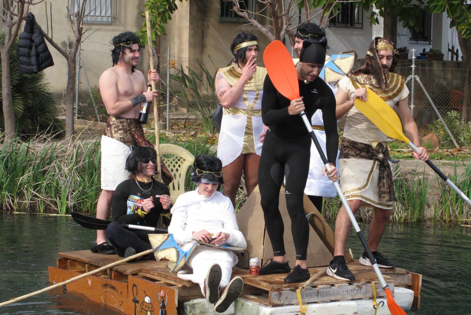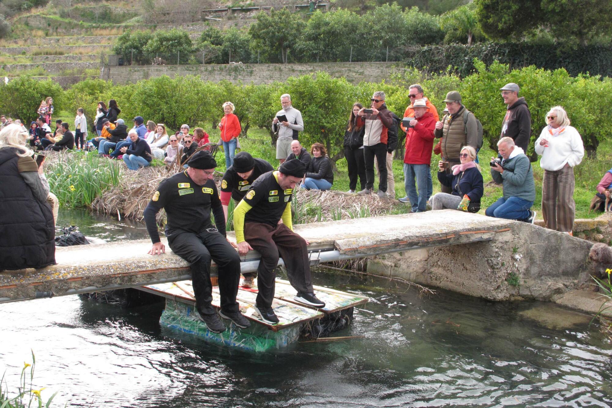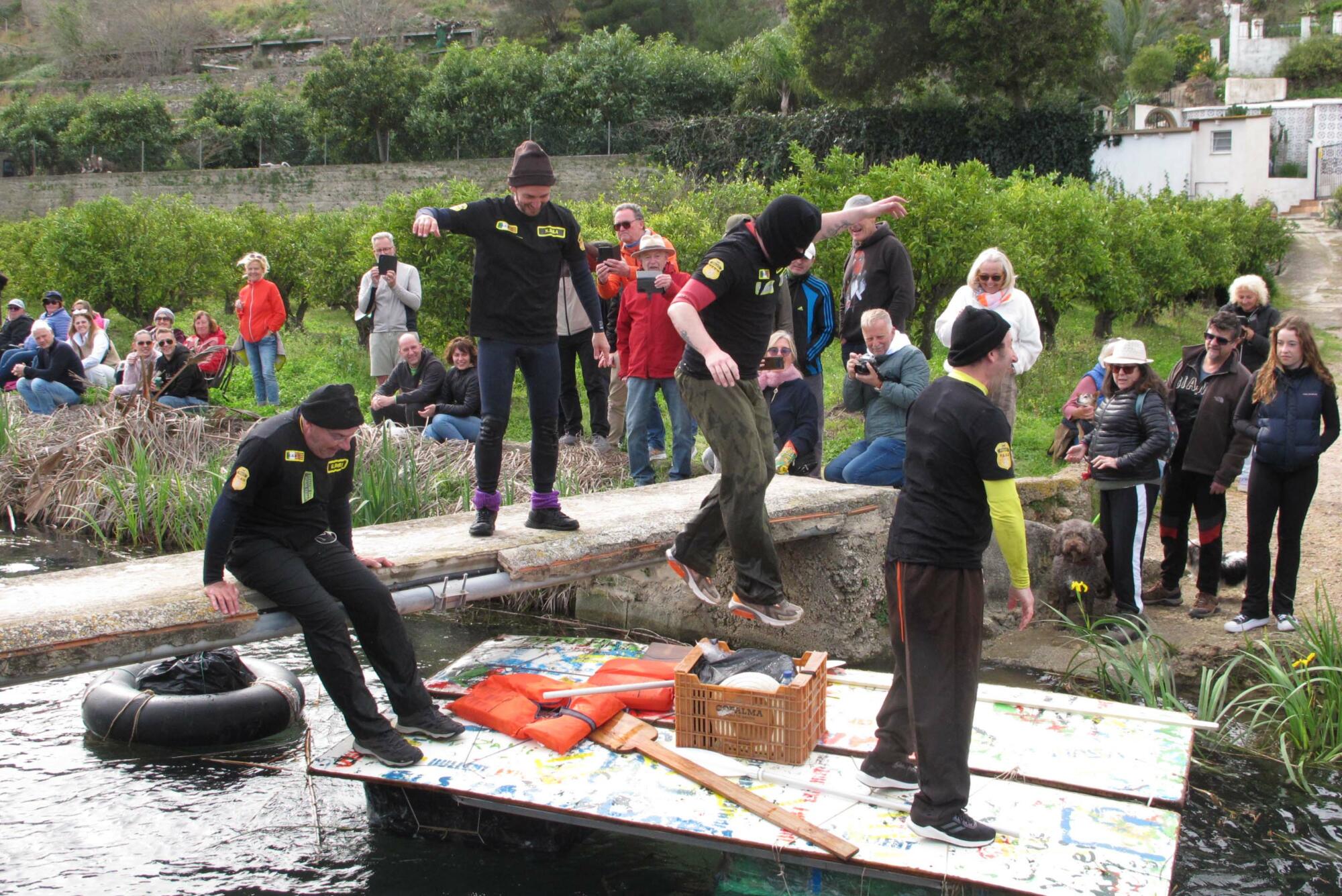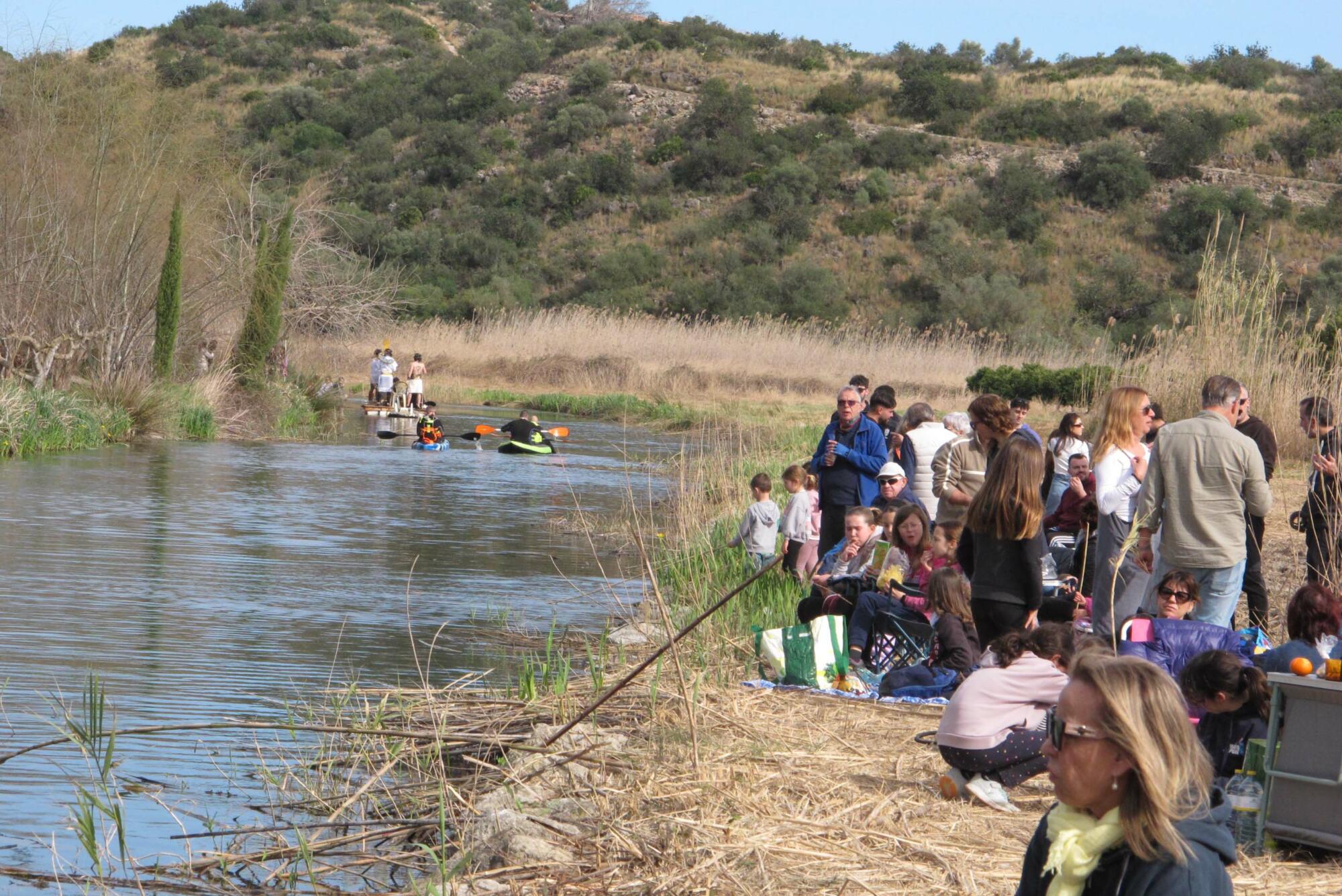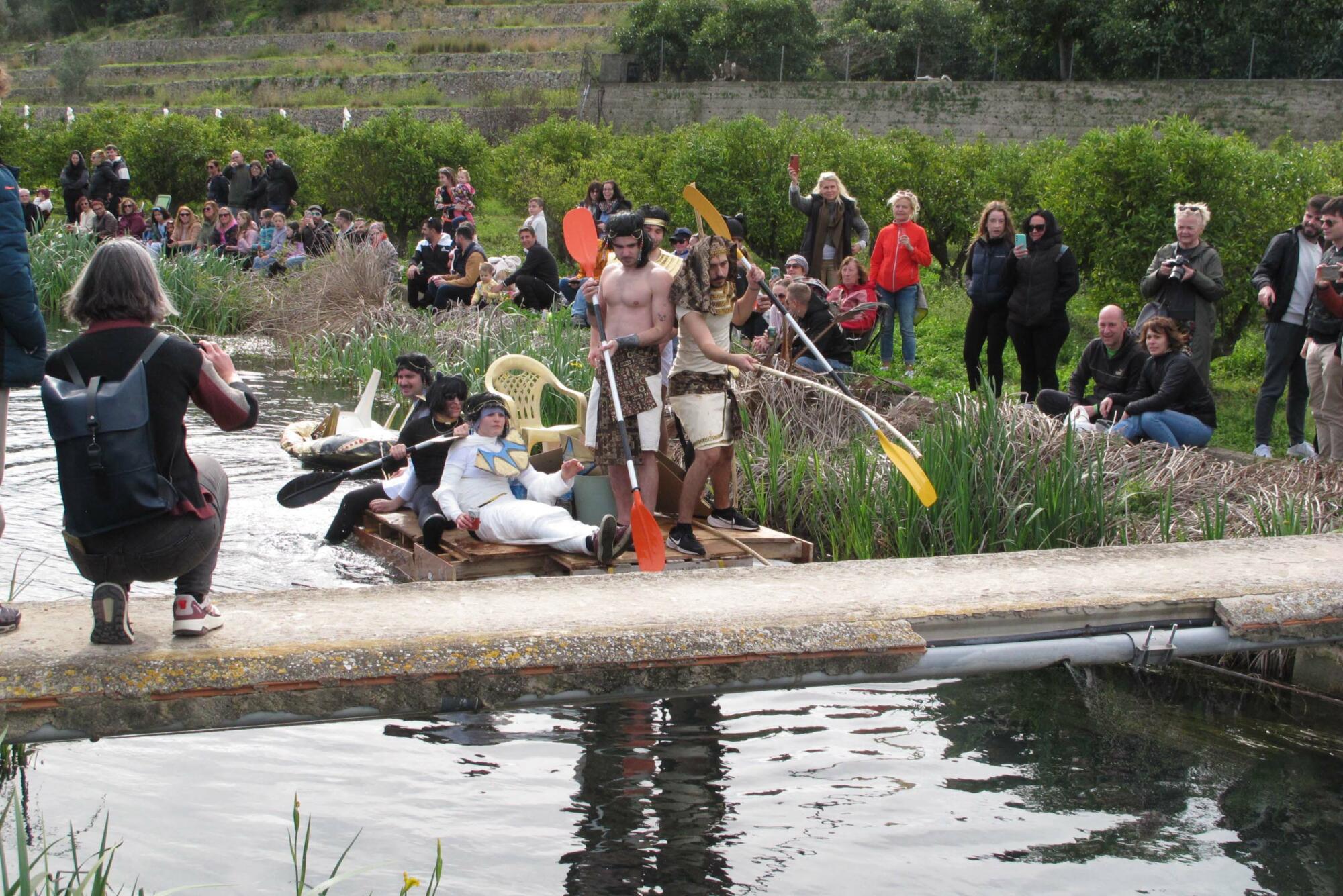 Una atípica carrera de embarcaciones caseras que «surcan» las aguas del río Bullent, por el paraje de la Marjal de Pego-Oliva, ante la atenta y divertida mirada del público que se congrega alrededor.