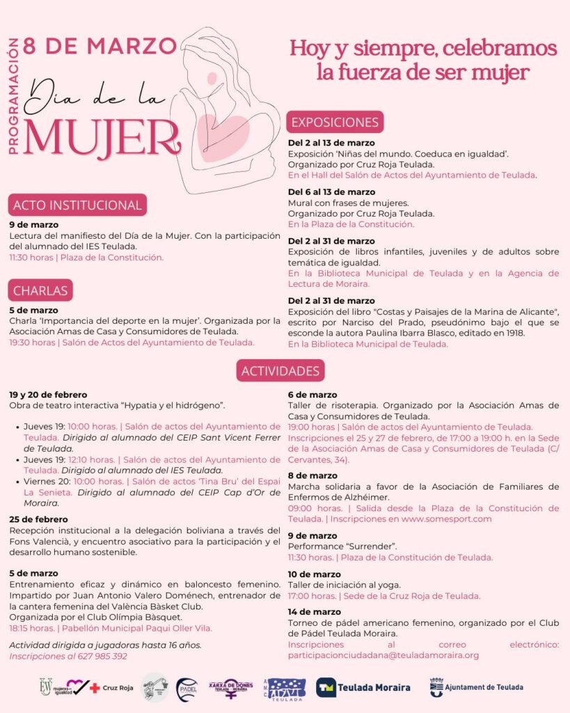 • Del 6 al 13 de marzo: Mural con frases de mujeres, organizado por Cruz Roja Teulada. Ubicación: Plaza de la Constitución.