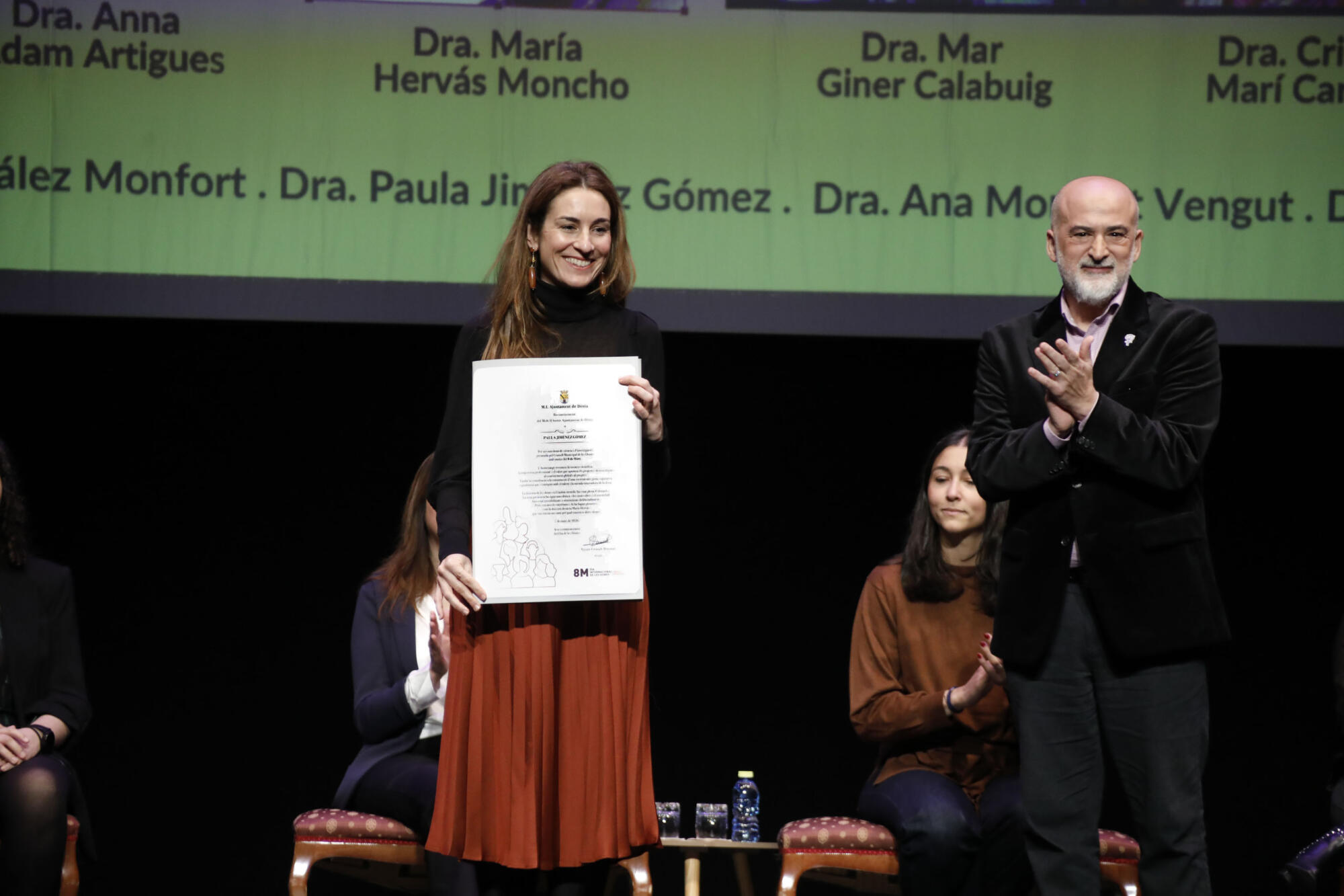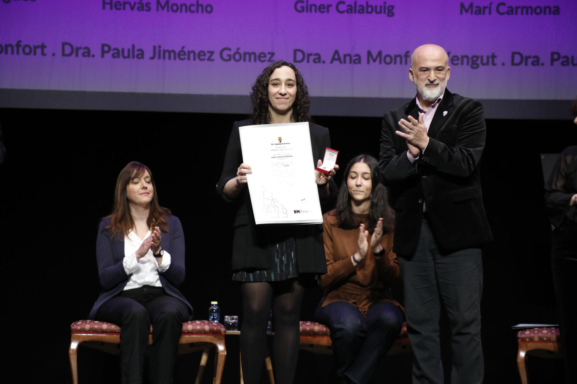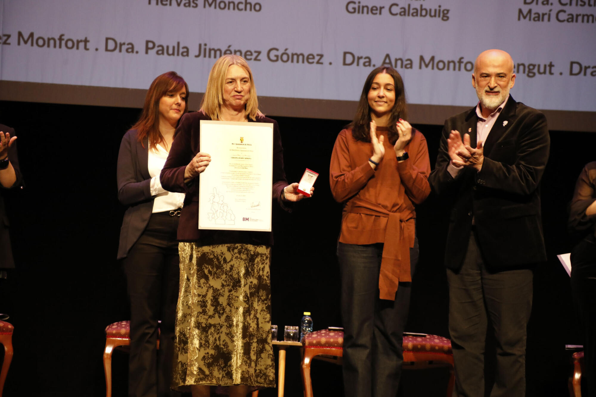 En representación de estas, tomaba la palabra, en primer lugar, Regina Monsalve, familiar de María Hervás; quien se mostraba orgullosa por su tía abuela, y recordaba cómo se consiguió una plaza en nombre de Hervás, en la ciudad. Monsalve explicaba que no entendía por qué su tía abuela no tenía una calle o plaza en su ciudad, como sí lo tenían sus compañeros de orla de Medicina en Valencia. Y su petición al Ayuntamiento fue el germen de dicha plaza, en pleno centro urbano dianense. También Monsalve quiso incidir en ese mensaje para las generaciones futuras: «podéis ser lo que queráis ser».