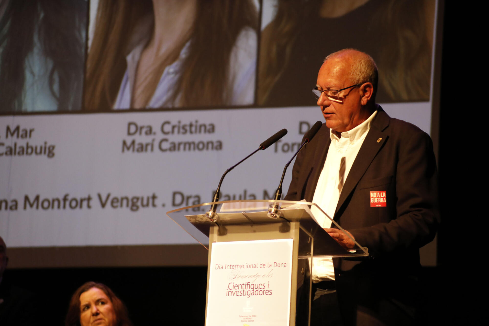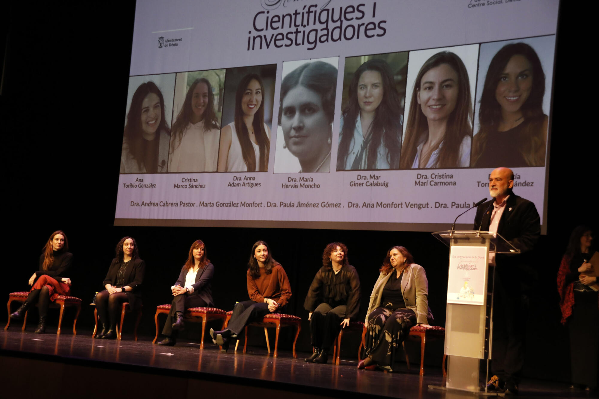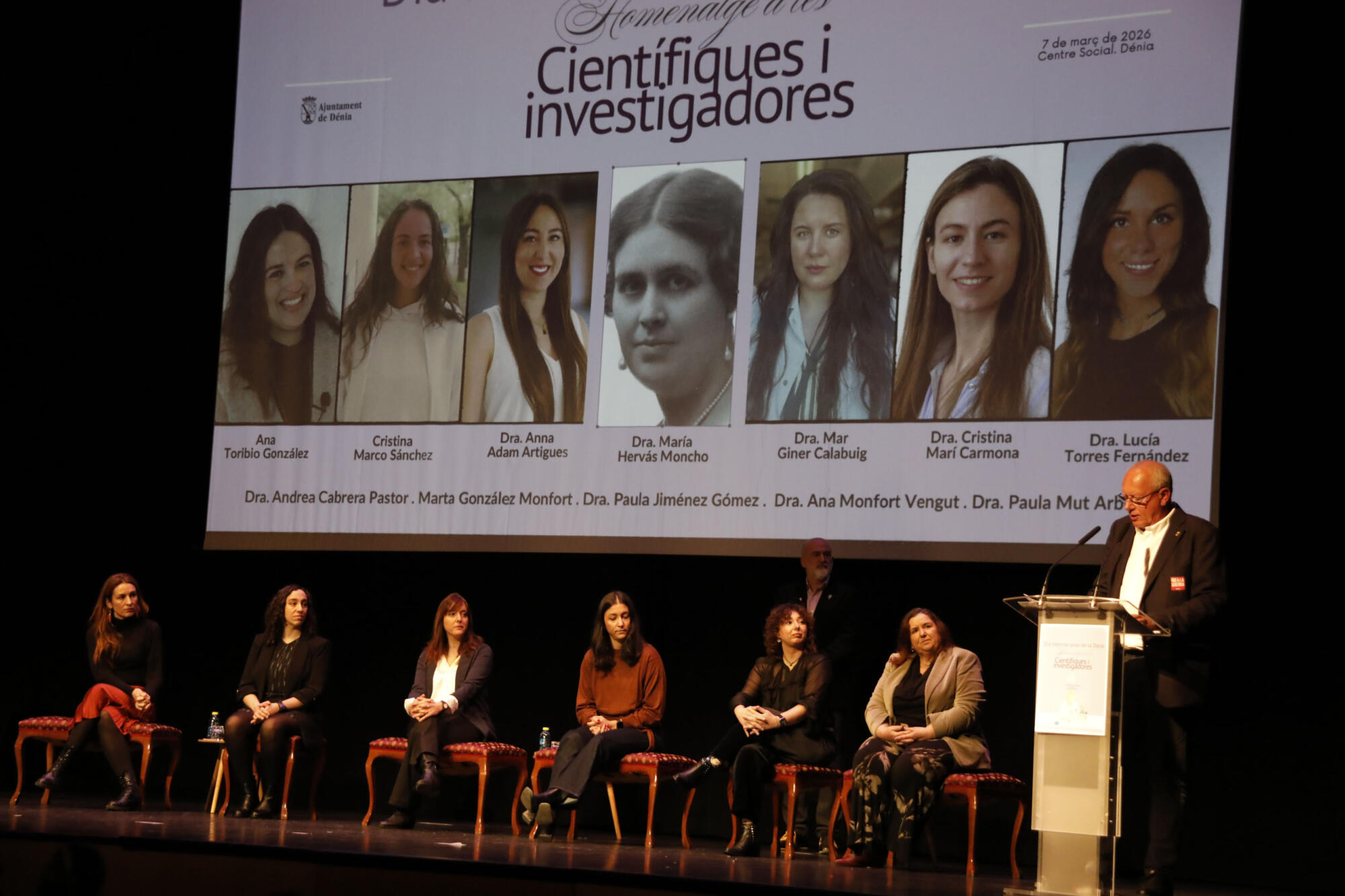 También el alcalde, Vicent Grimalt iniciaba su discurso con esa «invisibilización» de las mujeres en la ciencia, con un efecto de apagado de luces en el auditorio mientras iniciaba sus palabras para ir progresivamente encendiéndose, acompañada del mensaje de la necesidad de revertir dicha invisibilidad. Grimalt ponía en evidencia que menos de un tercio de las investigadoras son mujeres, y solo un 3% han recibido premios en ciencia. El munícipe incidía en la importancia de la contribución de la mujer a la ciencia, y finalizaba con un mensaje claro hacia las niñas y jóvenes: «vosotras también podéis ser lo que queráis ser».