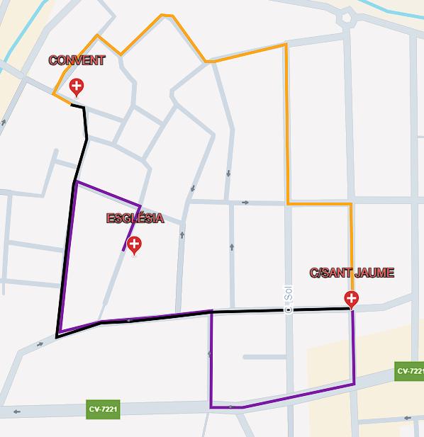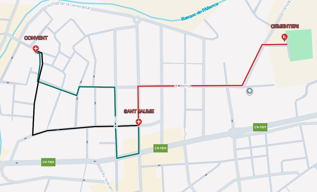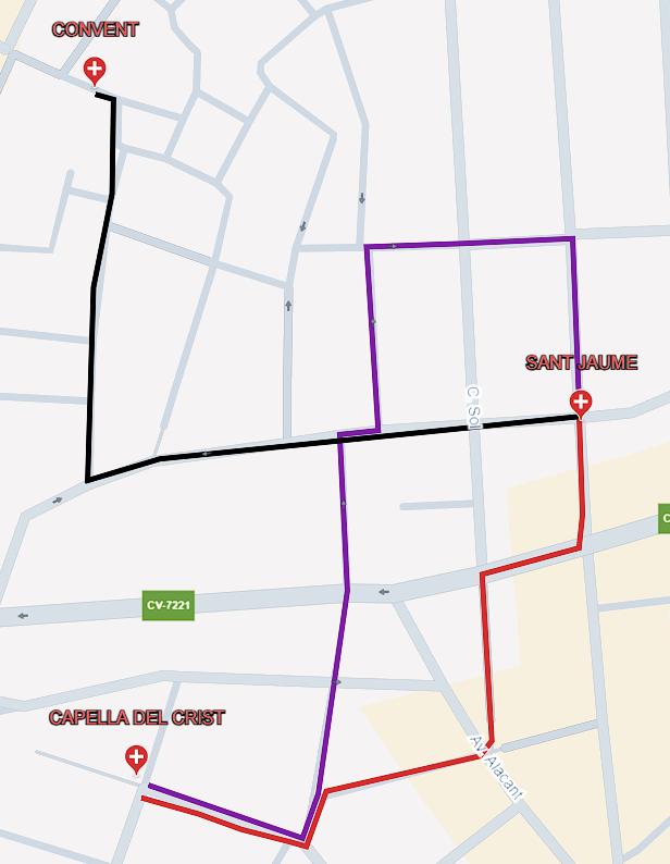 Recorrido: José Iturbi, 9 d’Octubre, Sant Joan de Déu, Santísima Trinidad, Virgen del Rosario, Mayor, San Vicente, Convento, El Prado.