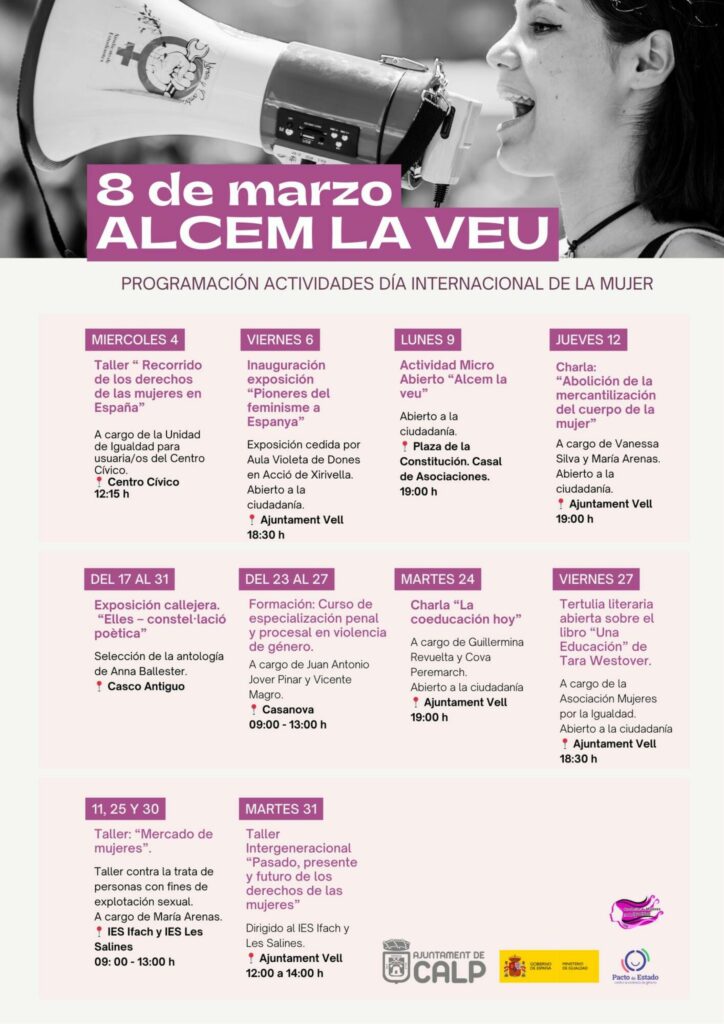 El Ayuntamiento de Calp ha puesto en marcha hoy su programación de actos conmemorativos con motivo del 8 de marzo, Día Internacional de las Mujeres. La agenda incluye talleres, exposiciones, charlas, actividades participativas y formación especializada, todas diseñadas para promover la igualdad y reconocer los derechos de las mujeres.